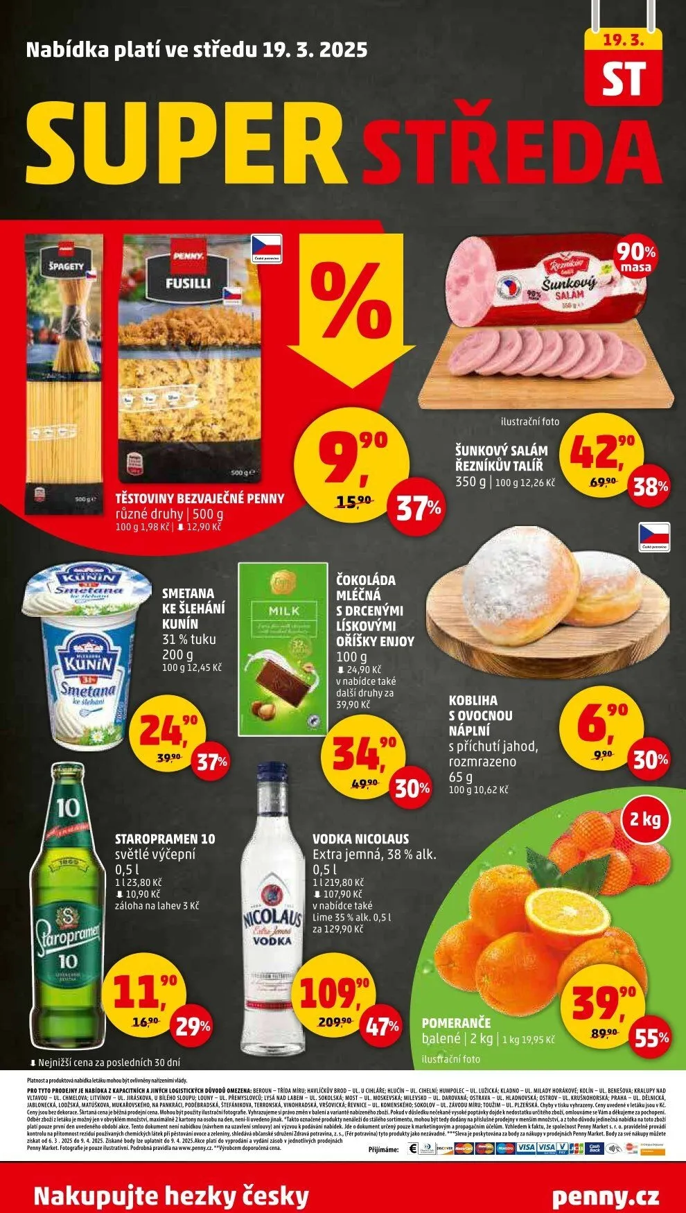 V letáku obchodu Penny Market na středu 19.3.2025 najdete širokou nabídku produktů za skvělé ceny. Mezi nimi jsou bezvaječné těstoviny Fusilu (500 g) za 100 g 9 Kč, smetana ke šlehání Kunín (200 g) za 100 g 12,45 Kč a světlé výčepní pivo Staropramen 10 (1 l) za 23,80 Kč.
