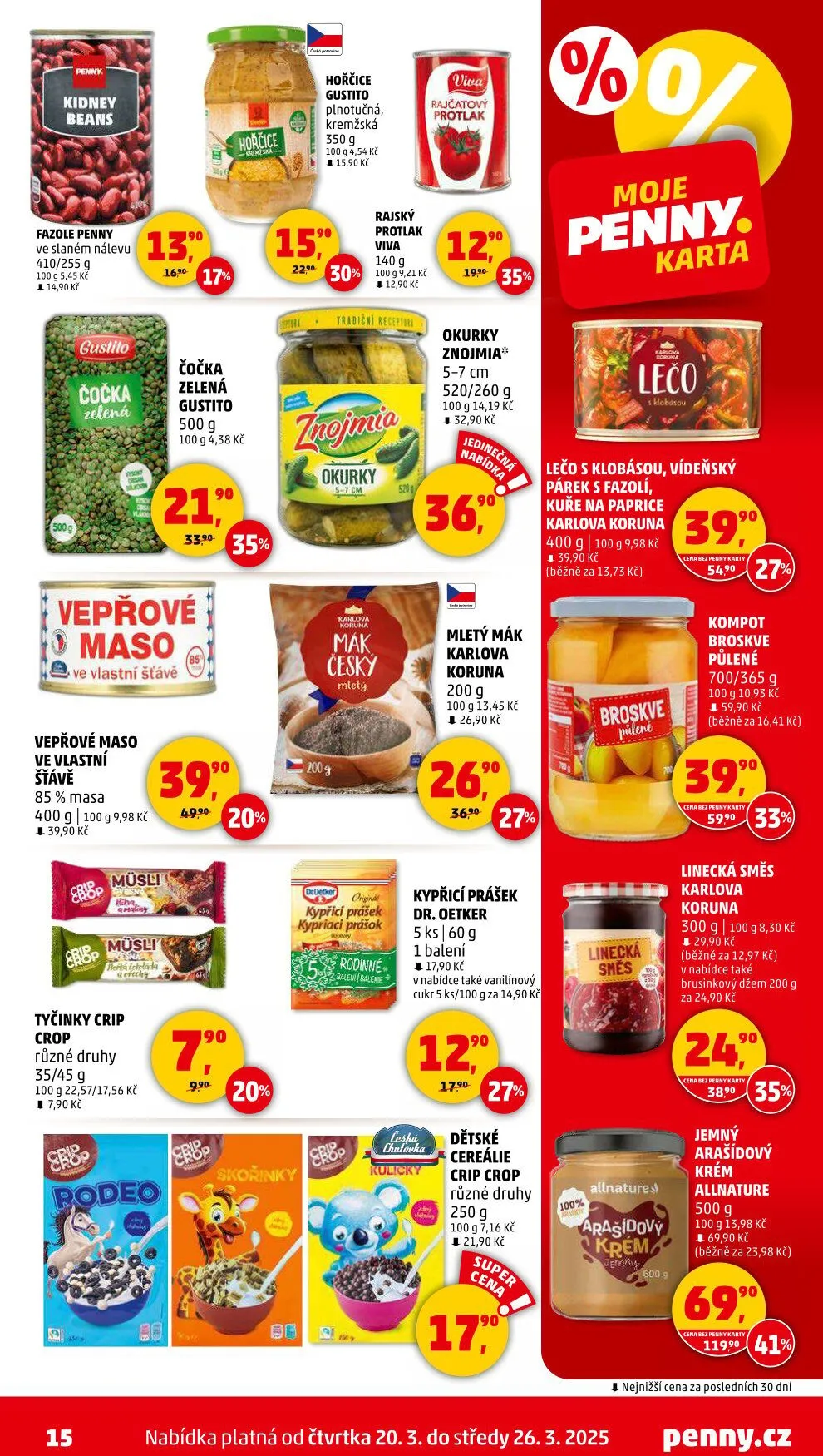Mezi nimi jsou fazole Penny ve slaném nálevu (410/255 g) za 14,90 Kč, plnotučná hořčice Gustito (350 g) za 15,90 Kč a rajský protlak Viva (140 g) za 12,90 Kč.