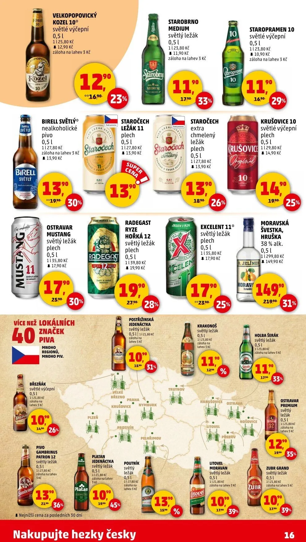 V letáku obchodu Penny Market najdete širokou nabídku piva za skvělé ceny. Například Velkopopovický Kozel světlé výčepní za 12,90 Kč, Starobrno medium za 11,90 Kč a Staropramen 10 za 10,90 Kč. Nezapomeňte na nealkoholické pivo Birell světlý za 13,90 Kč.