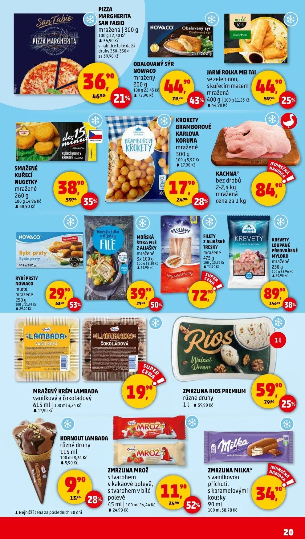 V letáku obchodu Penny Market najdete širokou nabídku mražených produktů. Mezi nimi se objevují lahodné pizzy Margherita značky San Fabio o hmotnosti 300 g za 36,90 Kč, s možností výběru z dalších druhů. Dále si můžete pochutnat na obalovaných kuřecích nugetkách Nowaco (260 g) za 38,90 Kč nebo rybích prstech Nowaco, které jsou také v nabídce.