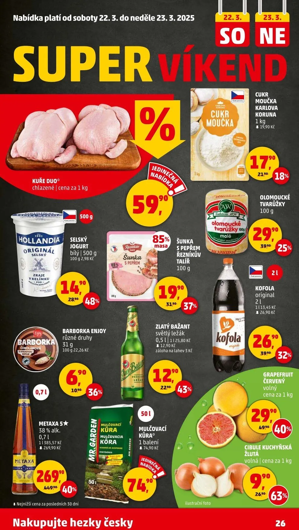 V letáku obchodu Penny Market najdete skvělou víkendovou nabídku, která platí od soboty 22.3. do neděle 23.3.2025. Mezi hlavními produkty se objevuje chlazené kuře duo za 90 Kč/kg. Dále si můžete vybrat šunku s pepřem Hollandia za 48 Kč/500 g nebo selské jogurty bílý za 2,98 Kč/100 g.