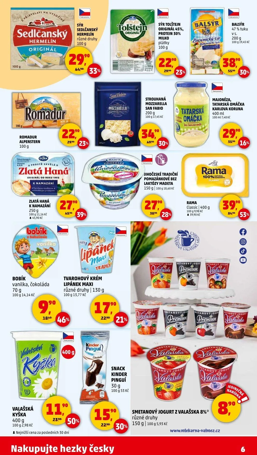 V letáku obchodu Penny Market najdete širokou nabídku kvalitních sýrů a mléčných výrobků. Mezi nimi se objevují oblíbené produkty jako Sedlčanský hermelín, originál Tolštejn s 45% obsahem tuku, a strouhaná mozzarella San Fabio. Pro milovníky pomazánek je k dispozici Jihočeské tradiční pomazánkové bez laktózy od Madety.