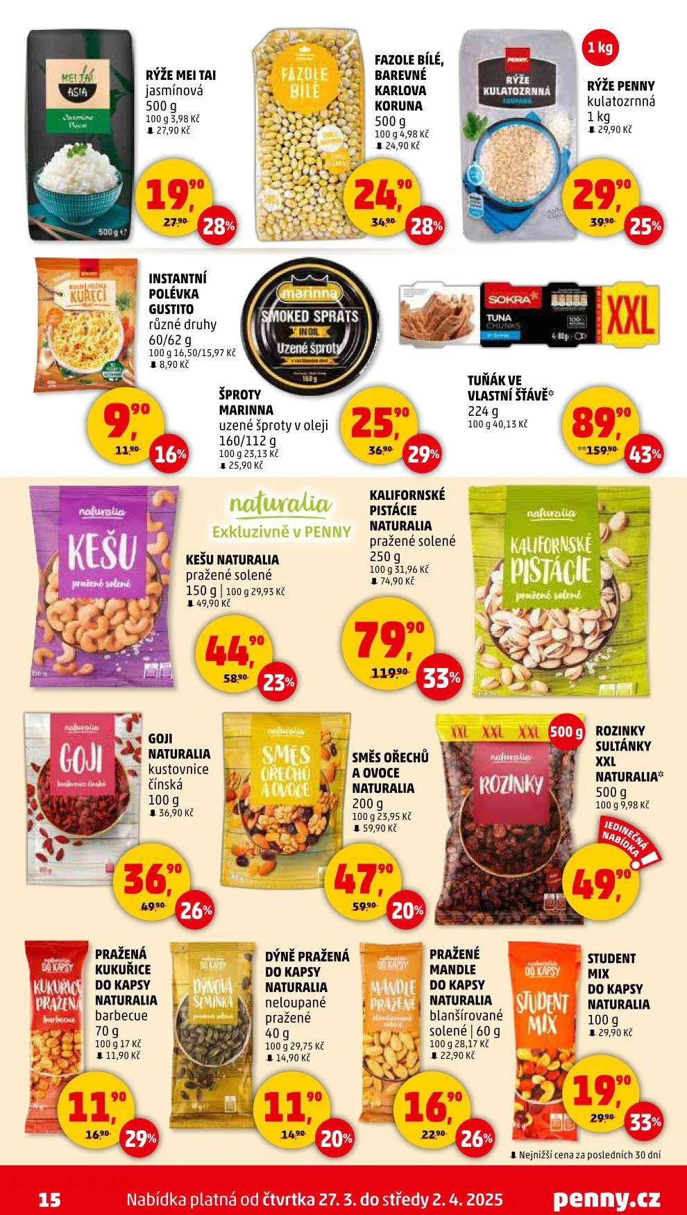 Dále si můžete vybrat kalifornské pistácie Naturalia 250 g za 74,90 Kč, kulatozrnnou rýži Penny 1 kg za 29,90 Kč, a uzené šproty v oleji Marinna 160/112 g za 25,90 Kč.