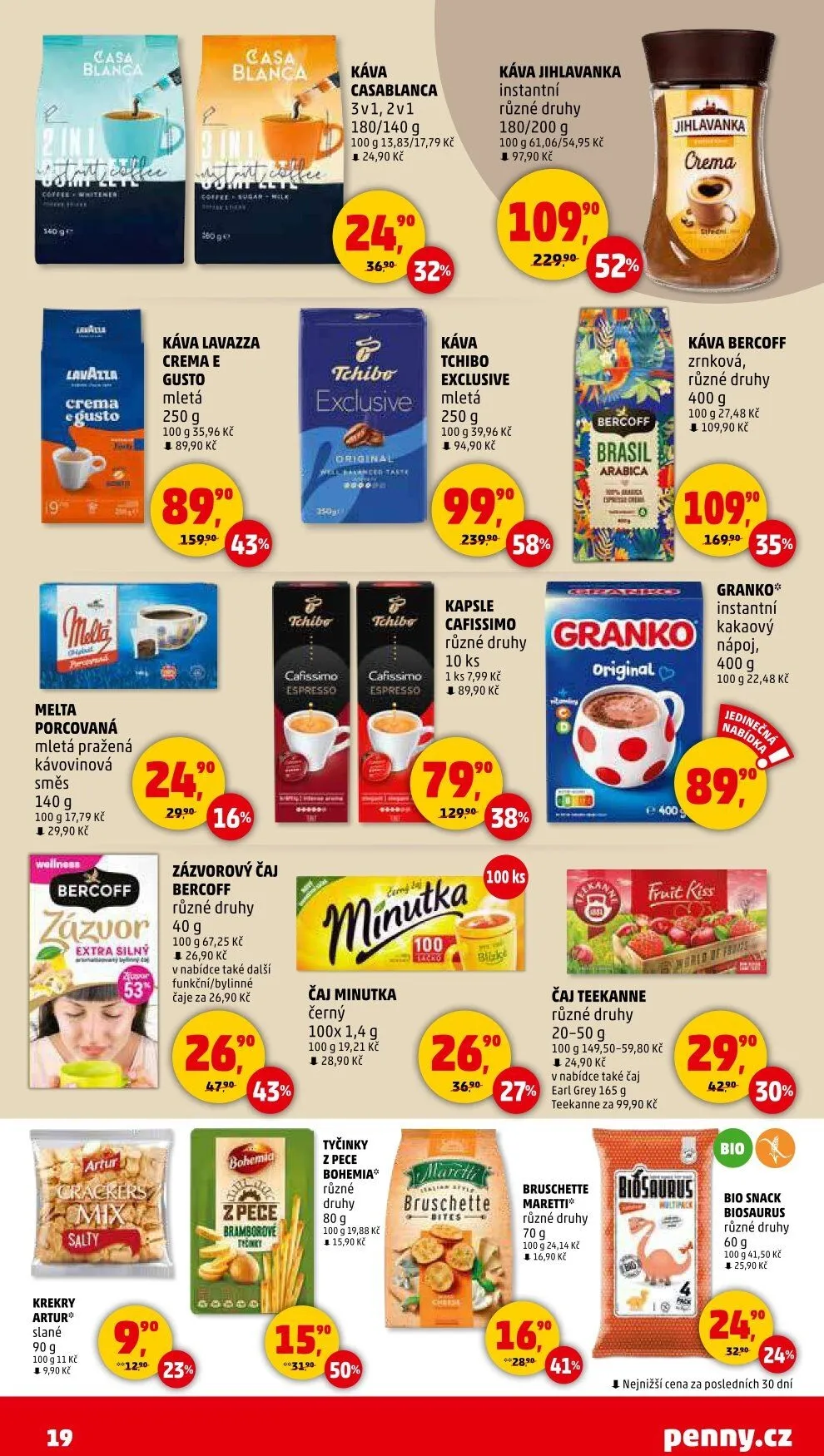 V letáku obchodu Penny Market najdete širokou nabídku káv a čajů. Mezi kávami se objevují produkty jako mletá káva Lavazza Crema e Gusto (250 g za 89,90 Kč) a instantní káva Jihlavanka (180/200 g za 97,90 Kč). Pro milovníky kapslové kávy je k dispozici Cafissimo (10 ks za 89,90 Kč).