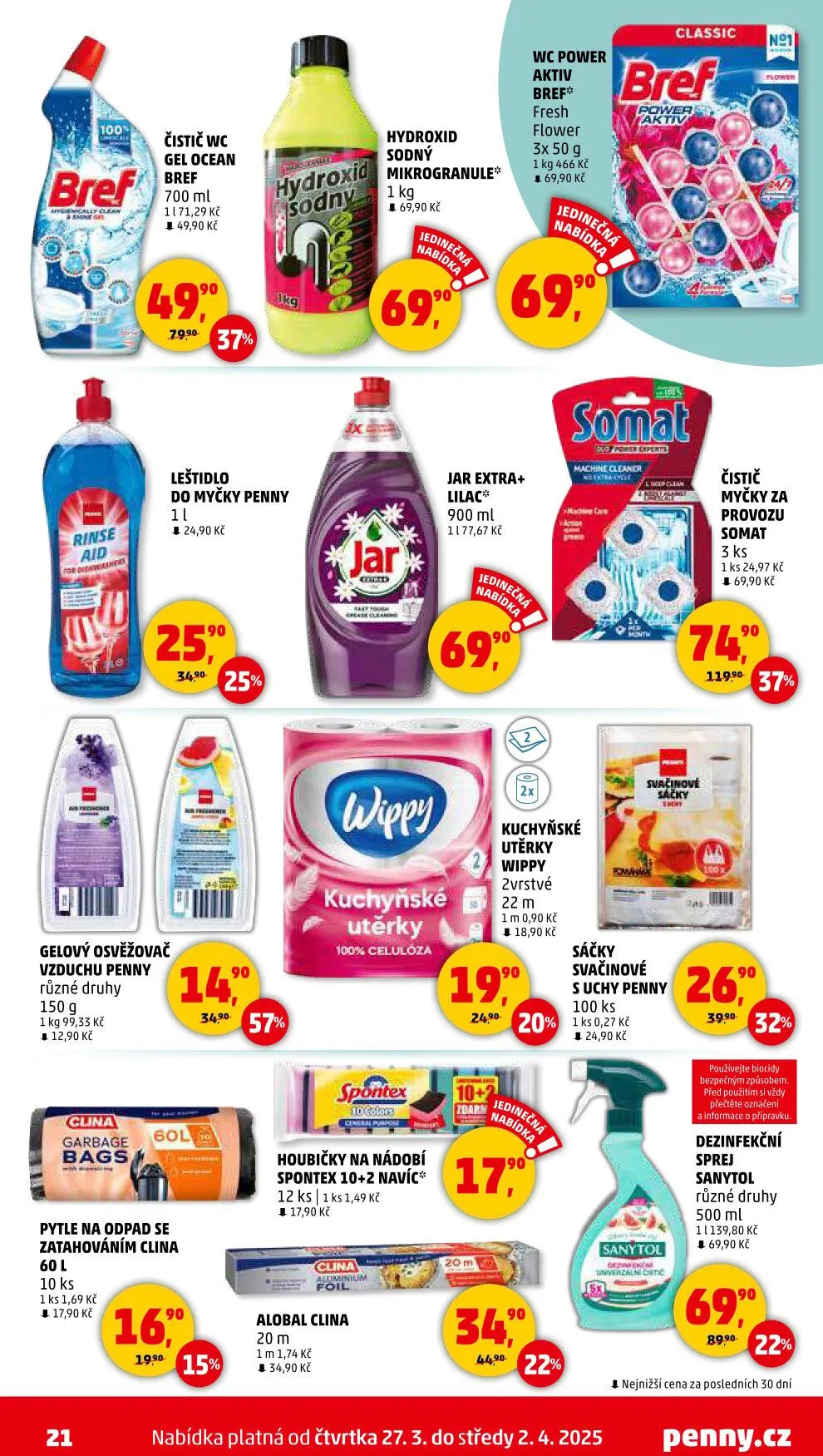 V letáku obchodu Penny Market najdete širokou nabídku produktů za výhodné ceny. Mezi nimi je čistič WC gel ocean od značky Bref, který je nyní za 49,90 Kč. Dále nabízíme leštidlo do myčky Penny za 24,90 Kč a kuchyňské utěrky Jar Extra+ v lilac variantě za 18,90 Kč.