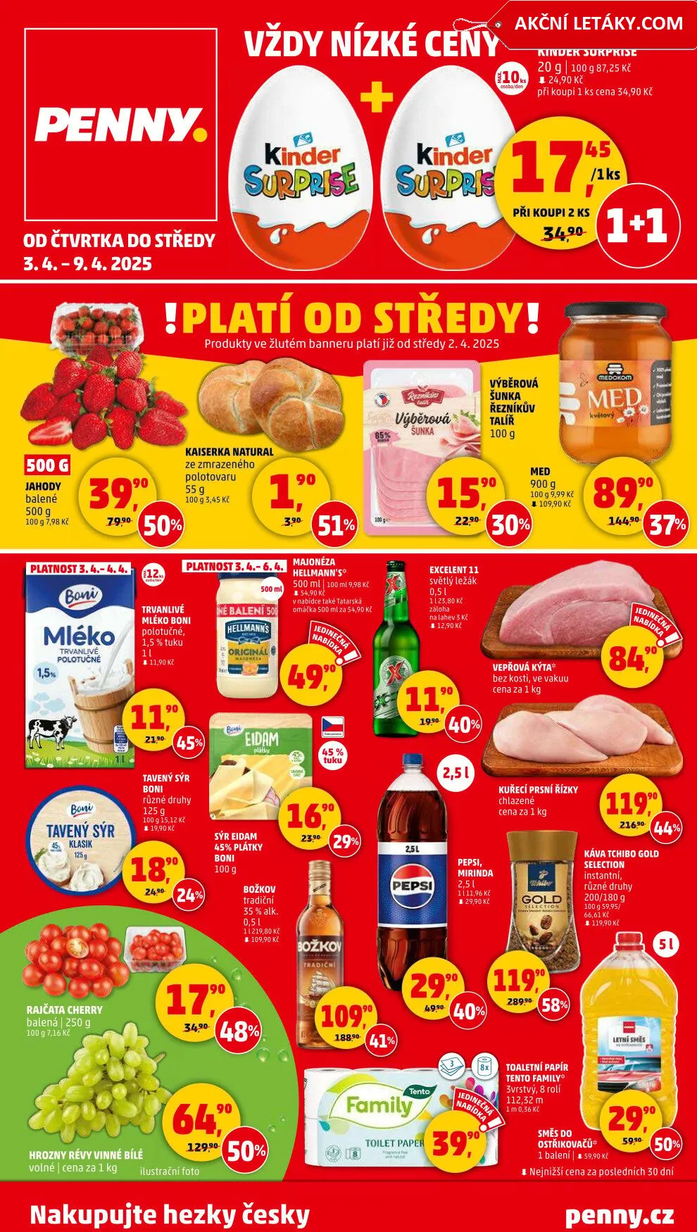 V Penny Marketu najdete vždy nízké ceny! Od čtvrtka 3.4. do středy 9.4.2025 si můžete vychutnat širokou nabídku produktů. Mezi nimi je Kinder Surprise 20 g za 24,90 Kč, nebo výběrová šunka Řezníkův talíř 100 g. Jahody balené 500 g jsou za 7,98 Kč/100 g.