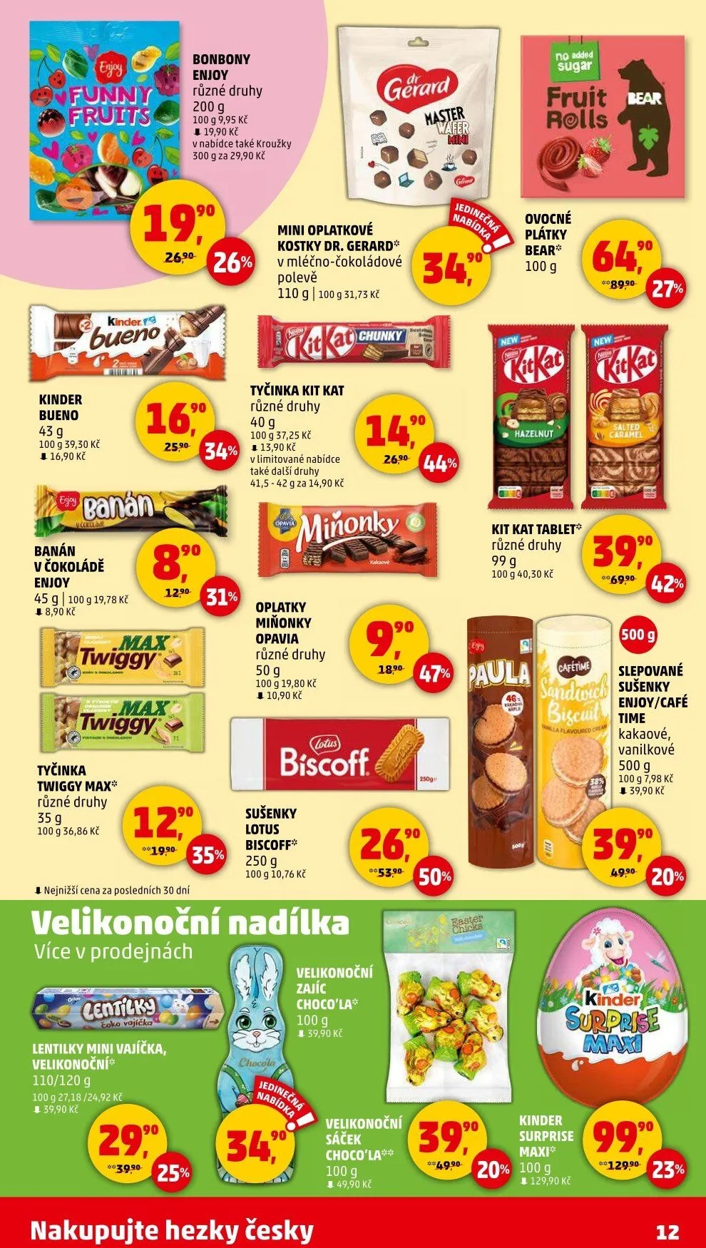 V letáku obchodu Penny Market najdete širokou nabídku sladkostí a pochoutek. Mezi oblíbené produkty patří Kinder Bueno (43 g) za 16,90 Kč a banán v čokoládě Enjoy (45 g) za 8,90 Kč. Dále si můžete vybrat tyčinku Twiggy Max (35 g) za 12,90 Kč nebo bonbony Enjoy (200 g) za 19,90 Kč.