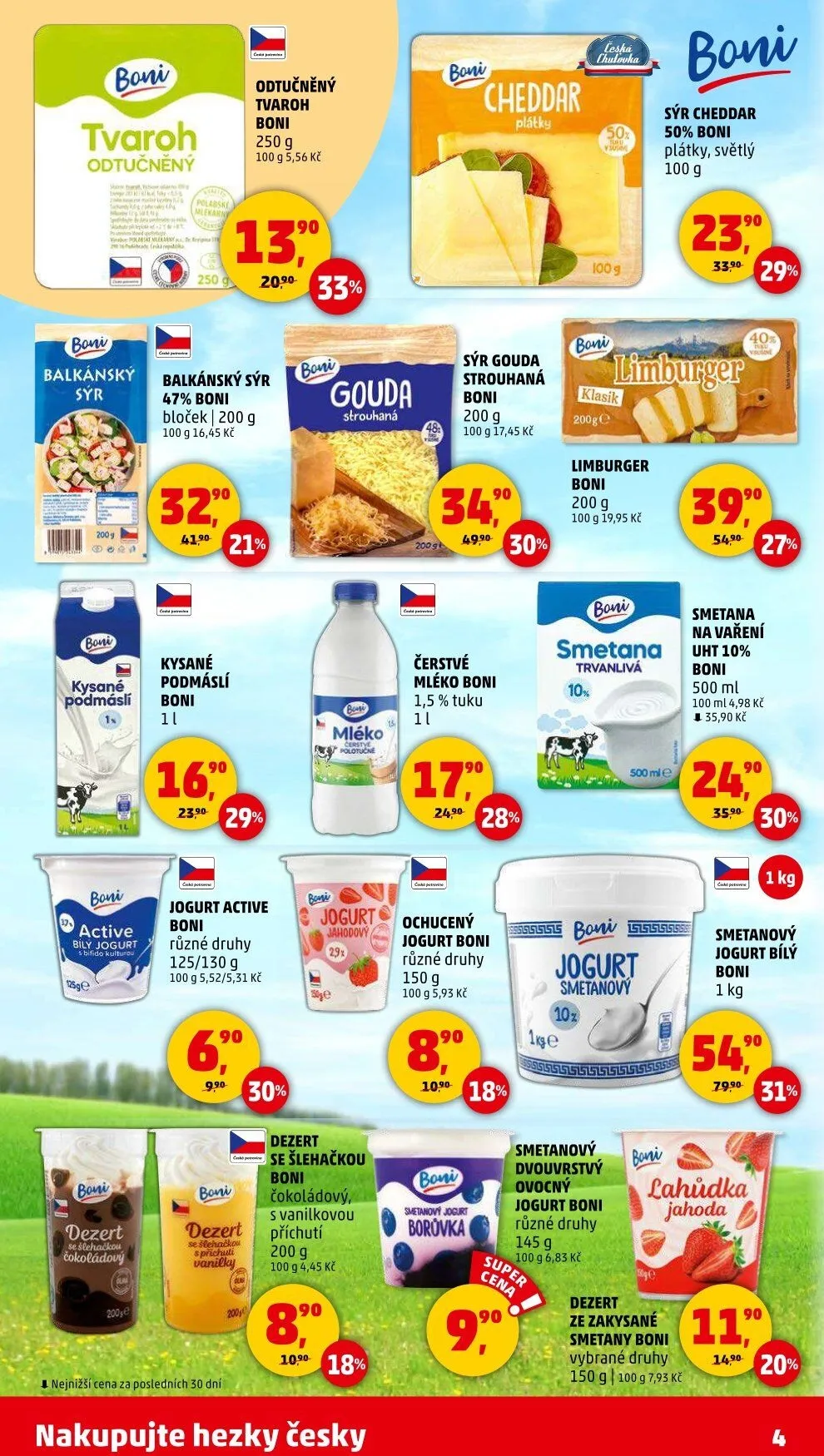 V letáku obchodu Penny Market najdete širokou nabídku mléčných výrobků značky Boni. Mezi nimi se nachází odtučněný tvaroh (250 g) za 5,56 Kč/100 g, plátky sýra Cheddar (50% tuku) a balkánský sýr (200 g) za 16,45 Kč/100 g. Dále nabízíme kysané podmáslí a různé druhy jogurtů, včetně ochuceného jogurtu (150 g) za 5,93 Kč/100 g.