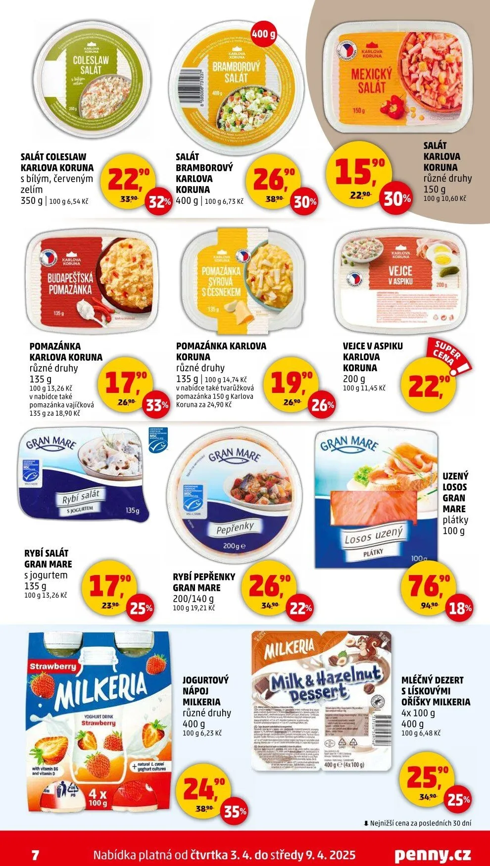V letáku obchodu Penny Market najdete širokou nabídku chutných produktů. Mezi nimi je salát coleslaw s bílým a červeným zelím, který váží 350 g a stojí 6,54 Kč. Dále nabízíme různé druhy pomazánek Karlova koruna, včetně vajíčkové pomazánky za 18,90 Kč a rybí pomazánky Gran Mare s jogurtem za 13,26 Kč.