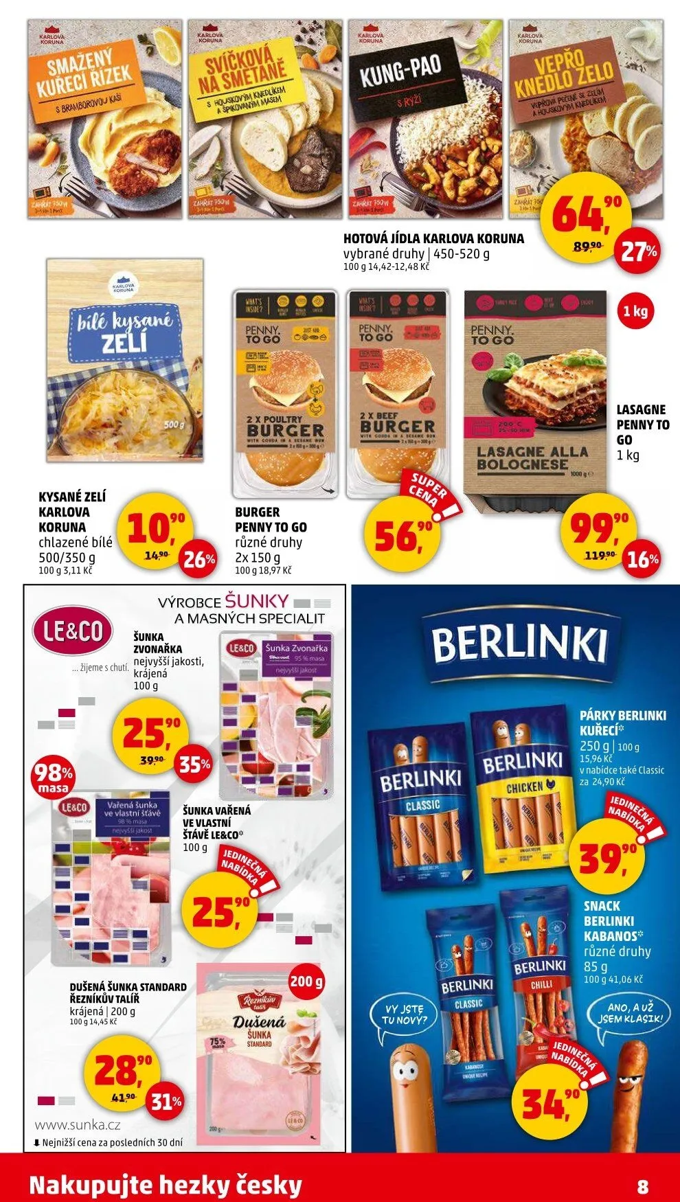 V letáku obchodu Penny Market najdete širokou nabídku hotových jídel a masných výrobků. Mezi nimi se objevují hotová jídla Karlova Koruna v různých variantách o hmotnosti 450-520 g. Dále si můžete vybrat z chlazeného bílého kysaného zelí Karlova Koruna, které je k dispozici v balení 500/350 g za 5,11 Kč.
