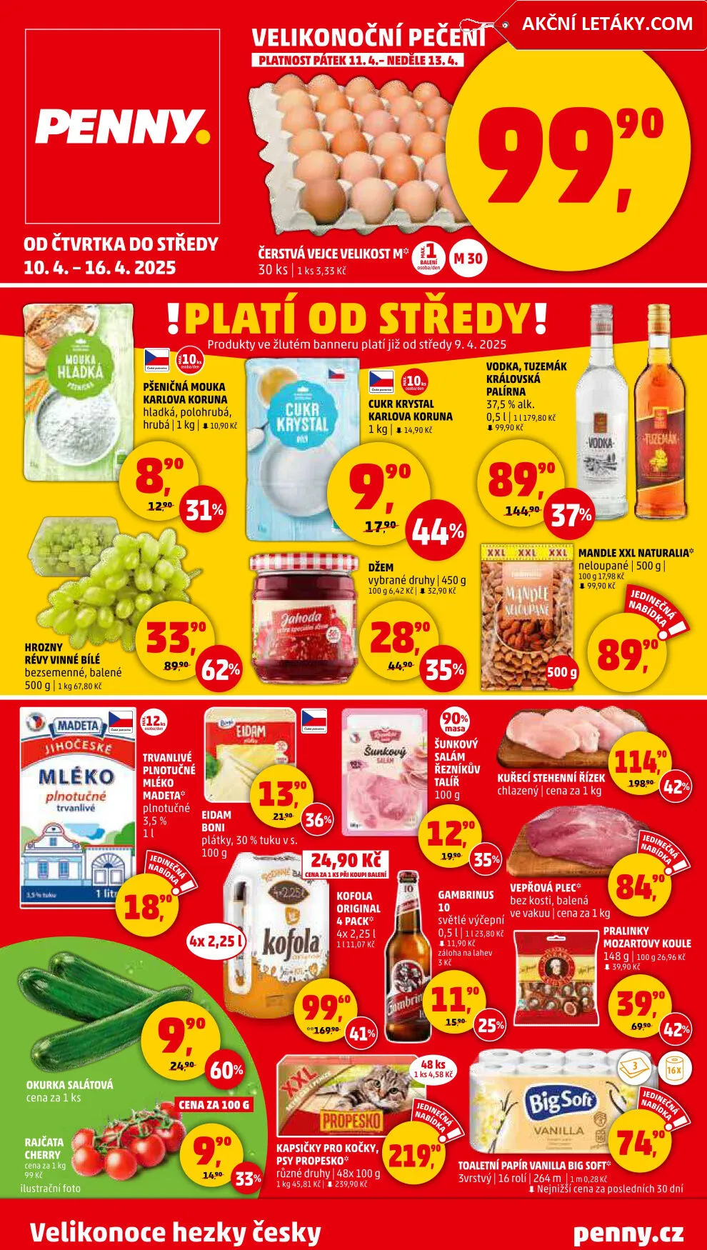 V Penny Marketu probíhá velikonoční pečení s platností od pátku 11. do neděle 16. dubna 2025. Čerstvá vejce velikosti W jsou k dispozici od středy 9. dubna 2025. V letáku najdete také hrozny bezsemenné, plnotučné trvanlivé mléko, salátové okurky a cherry rajčata.