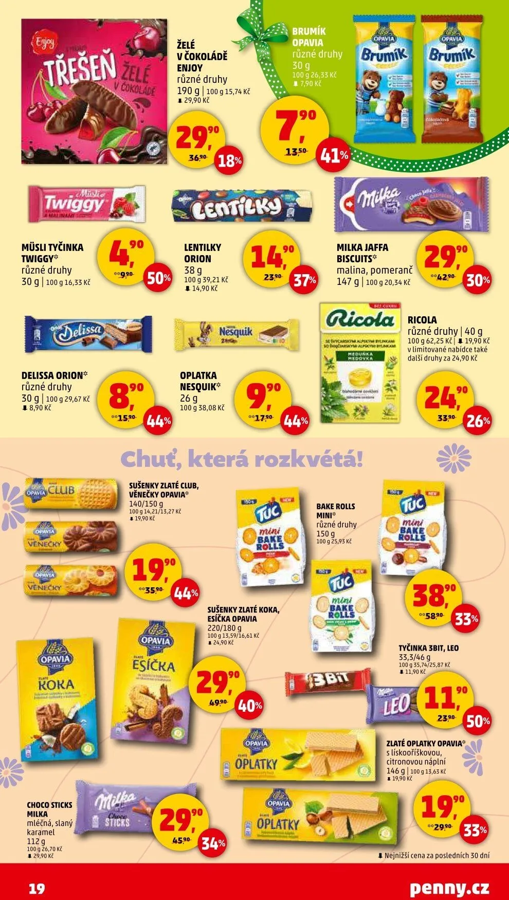 V letáku obchodu Penny Market najdete širokou nabídku chutných produktů. Mezi nimi jsou například müsli tyčinky Twiggy v různých druzích, které si můžete pořídit za 8,90 Kč za 30 g. Dále si můžete vychutnat čokoládové tyčinky Delissa Orion, které stojí 29,90 Kč za 112 g.