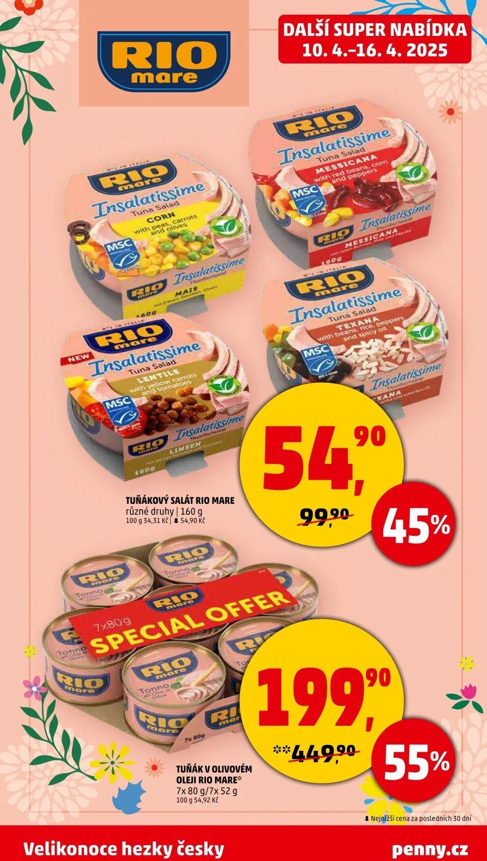 V letáku obchodu Penny Market najdete skvělé produkty, které potěší každého milovníka ryb. Mezi nimi je tuňákový salát Mo Mare v různých druzích, který má hmotnost 160 g a cenu 54,90 Kč. Dále si můžete vybrat tuňáka v olivovém oleji Rio Mare, který je dostupný v balení 7x80 g nebo 7x52 g, a jeho cena činí 54,92 Kč za 100 g. Nezapomeňte, že akce platí od 10. 4. do 16. 4. 2025. Navštivte penny.cz pro více informací a další skvělé nabídky!
