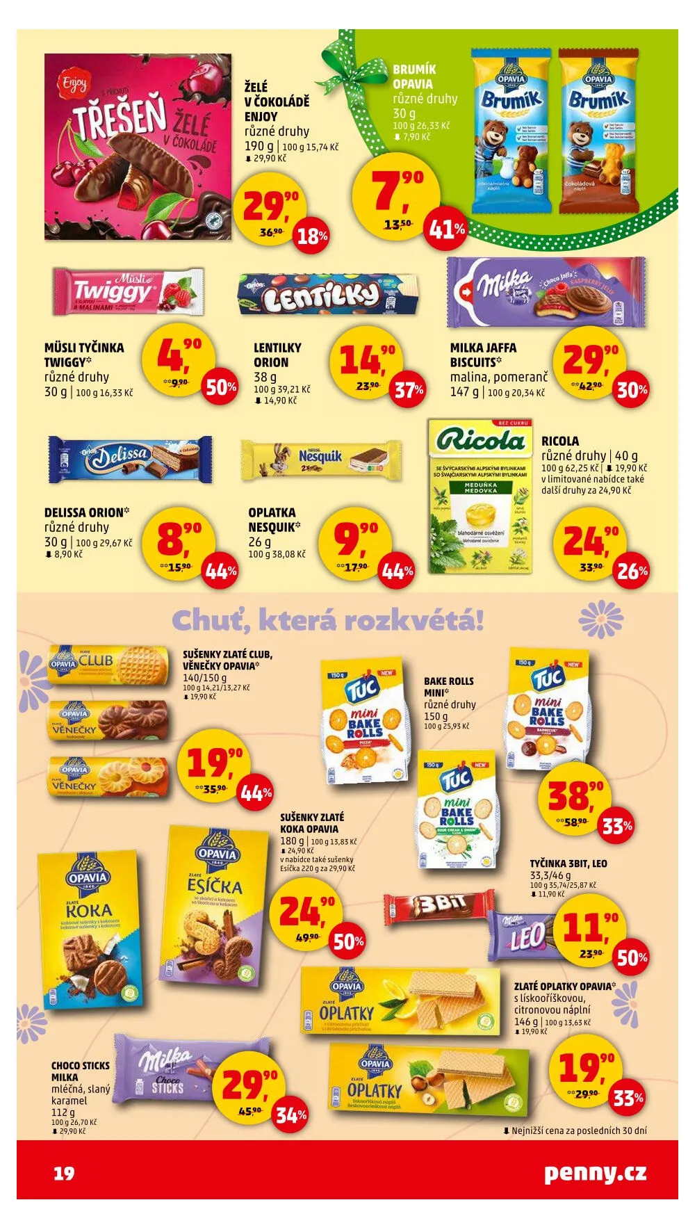 V letáku obchodu Penny Market najdete širokou nabídku chutných produktů. Mezi nimi jsou müsli tyčinky Twiggy v různých druzích za 16,33 Kč za 100 g. Delissa Orion nabízí různé druhy za 29,67 Kč za 100 g. Opavia přináší lahodné věnečky a želé v čokoládě, které stojí 19,90 Kč.