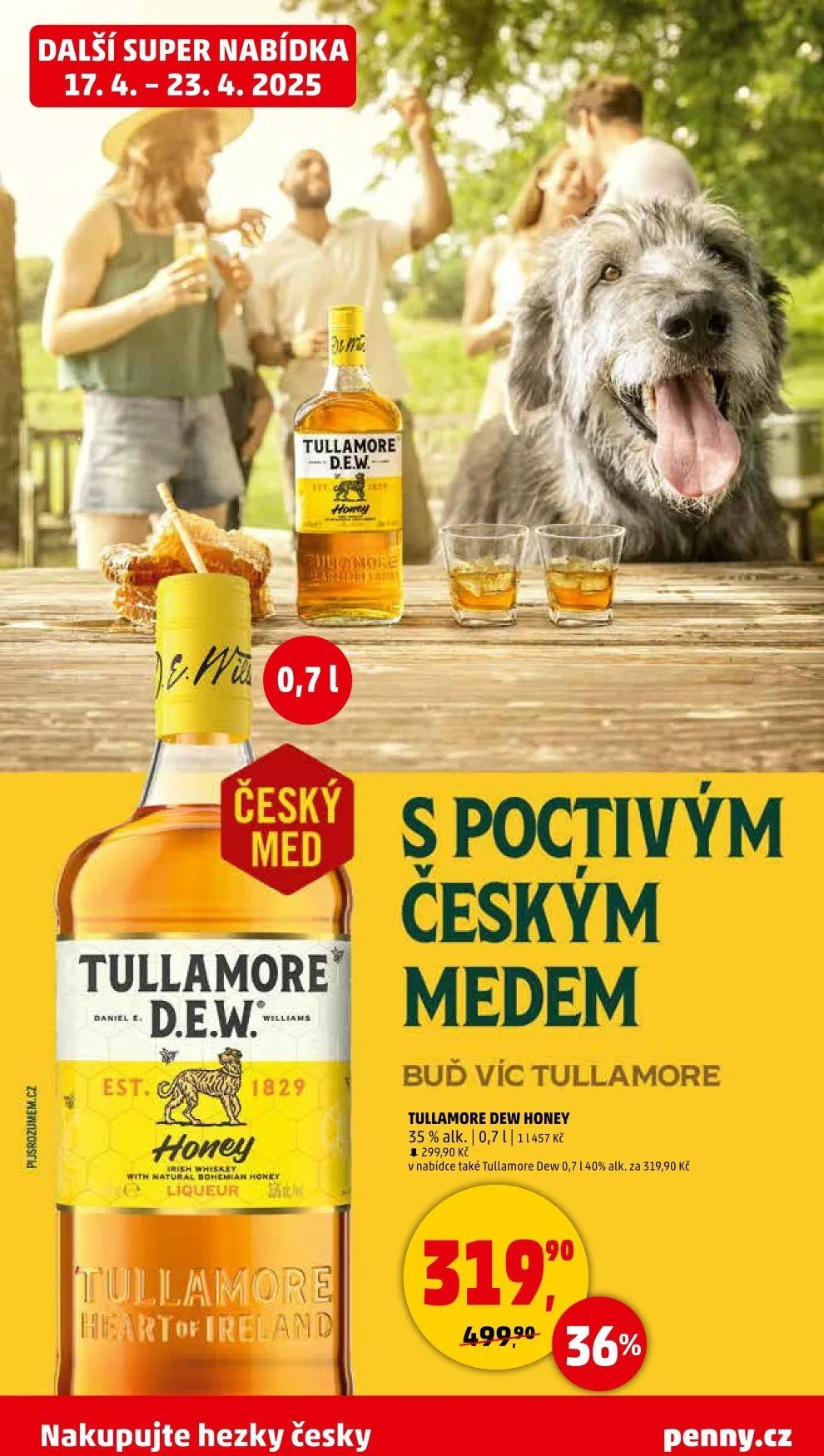 Od 17. 4. do 23. 4. 2025 si můžete pořídit Tullamore Dew Honey Liqueur s obsahem alkoholu 35 % za skvělou cenu 299,90 Kč.
