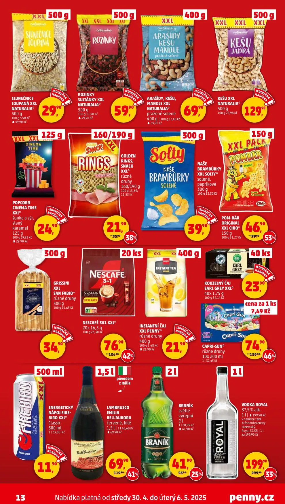 V letáku obchodu Penny Market najdete širokou nabídku produktů za skvělé ceny. Mezi nimi jsou loupané slunečnicové semínka Naturalia 500 g za 49,90 Kč, rozinky v různých variantách 160/190 g za 69,90 Kč a arašidy a kešu oříšky. Nezapomeňte také na naše brambůrky, které jsou k dostání v solené a paprikové variantě 300 g za 13,30 Kč.