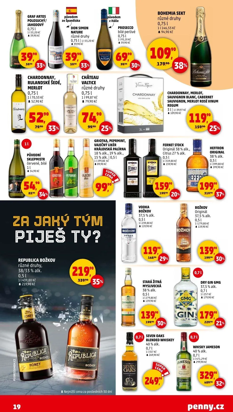 V letáku obchodu Penny Market najdete širokou nabídku kvalitních vín a lihovin. Mezi oblíbené produkty patří polosuché jahodové víno Graf Artos za 39,90 Kč, Chardonnay a Merlot za 52,90 Kč, nebo italské Prosecco za 59,90 Kč.