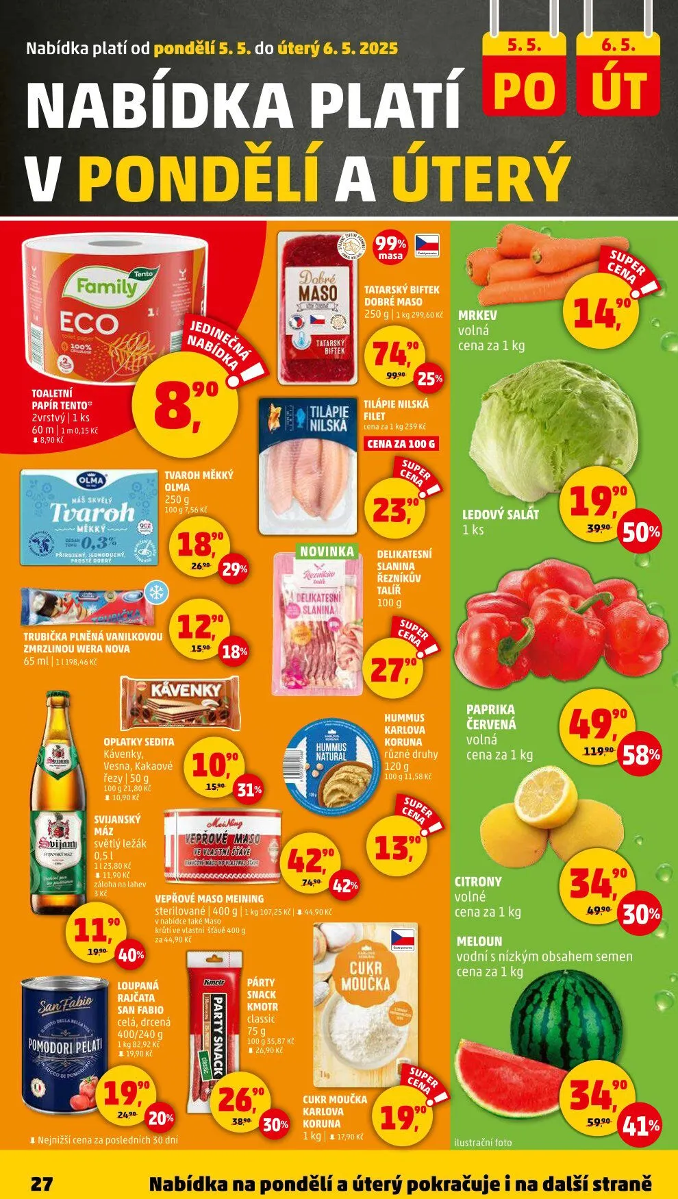 V letáku obchodu Penny Market najdete skvělou nabídku produktů, která platí od pondělí 5.5. do úterý 6.5. 2025. Mezi hlavními položkami je toaletní papír, 2vrstvý, za výhodnou cenu. Dále si můžete vychutnat tvaroh od značky Olma, a to jak v trubičce plněné vanilkovou zmrzlinou, tak měkký tvaroh.