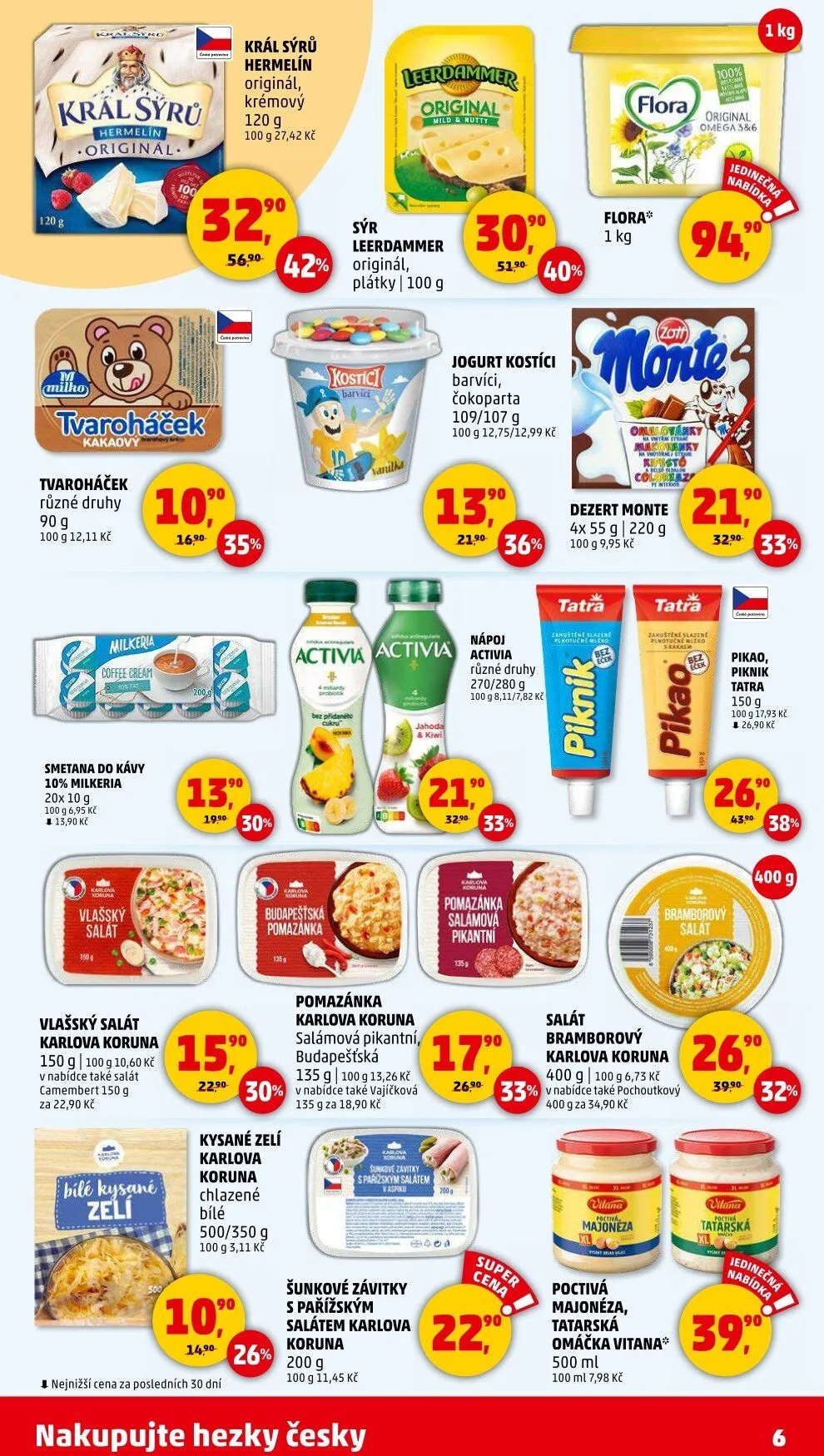 V letáku obchodu Penny Market najdete širokou nabídku kvalitních produktů. Mezi nimi se nachází král sýrů - originální hermelín a krémový sýr, oba v balení po 120 g. Dále nabízíme tvaroháček v různých druzích a smetanu do kávy Milkeria.