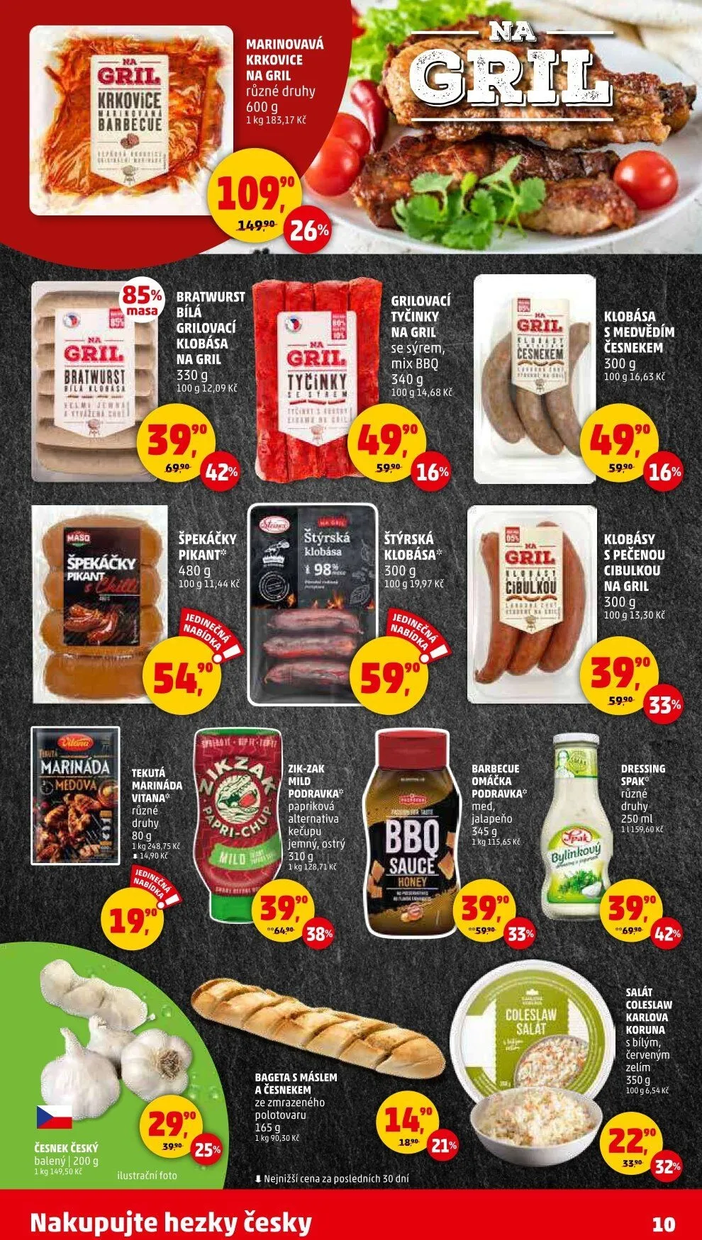 V letáku obchodu Penny Market najdete širokou nabídku grilovacích specialit. Mezi nimi se objevují marinované krkovice na gril o hmotnosti 600 g za 109,90 Kč, bílá grilovací klobása bratwurst za 12,09 Kč na 100 g a pikantní špekáčky o hmotnosti 480 g za 144,90 Kč.
