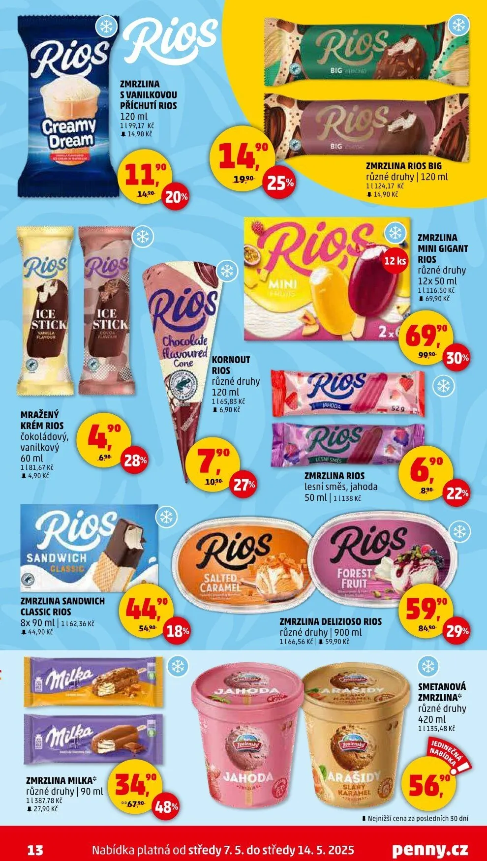 V letáku obchodu Penny Market najdete širokou nabídku zmrzliny Rios v různých příchutích. Mezi oblíbené produkty patří zmrzlina s vanilkovou příchutí v kornoutu (120 ml) za skvělou cenu 14,90 Kč. Dále si můžete vybrat zmrzlinu Rios Big (120 ml) nebo mražený krém Rios v čokoládové a vanilkové variantě (60 ml) za 4,90 Kč.