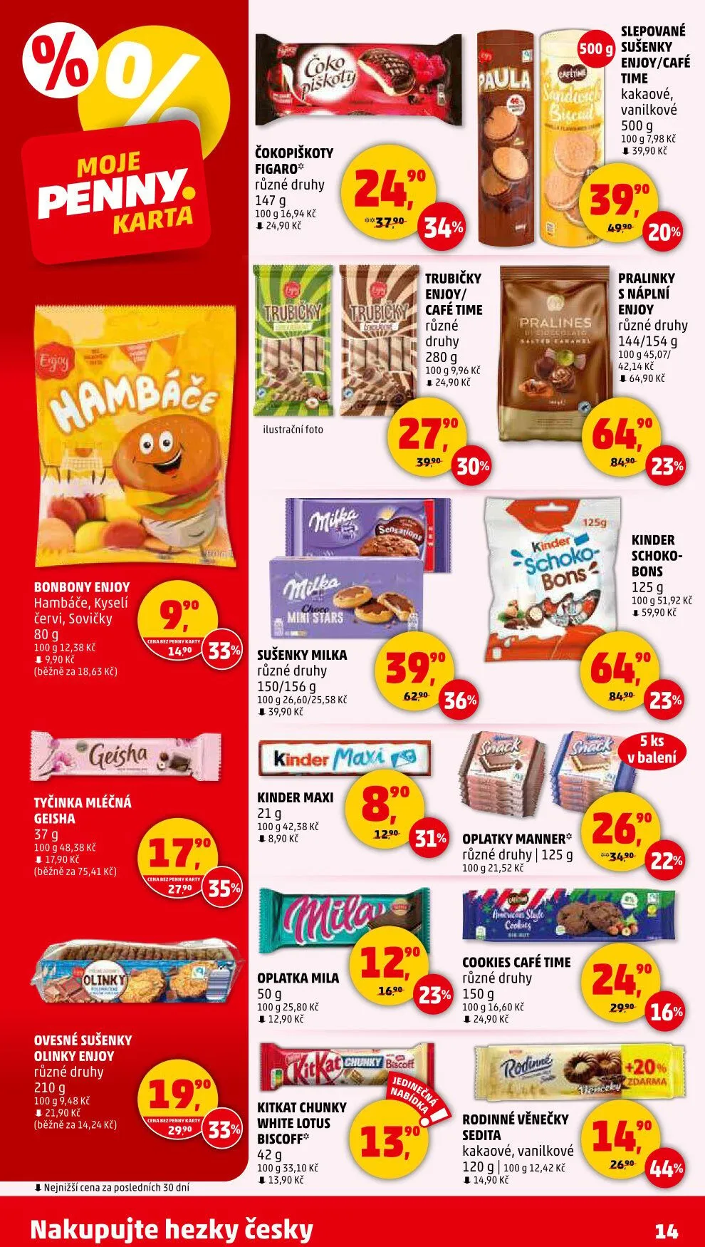 V letáku obchodu Penny Market najdete širokou nabídku sladkých pochoutek. Mezi nimi jsou čokopiškoty Figaro, které si můžete pořídit za 24,90 Kč za 100 g. Milovníci sušenek ocení sušenky Milka v různých druzích, které stojí 39,90 Kč za 150/156 g. Dále nabízíme Kinder Maxi oplatky za 8,90 Kč za 21 g a KitKat Chunky White Lotus za 13,90 Kč za 42 g.