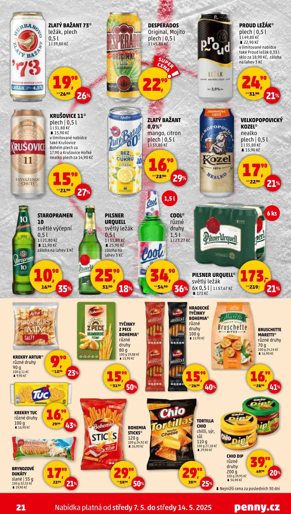 V letáku obchodu Penny Market najdete širokou nabídku nápojů a snacků. Mezi oblíbené pivo patří Zlatý Bažant ležák v plechu za 15,90 Kč a Krušovice plech za 17,90 Kč. Pro milovníky nealkoholických nápojů je k dispozici Krušovice hořké nealko plech za 14,90 Kč.