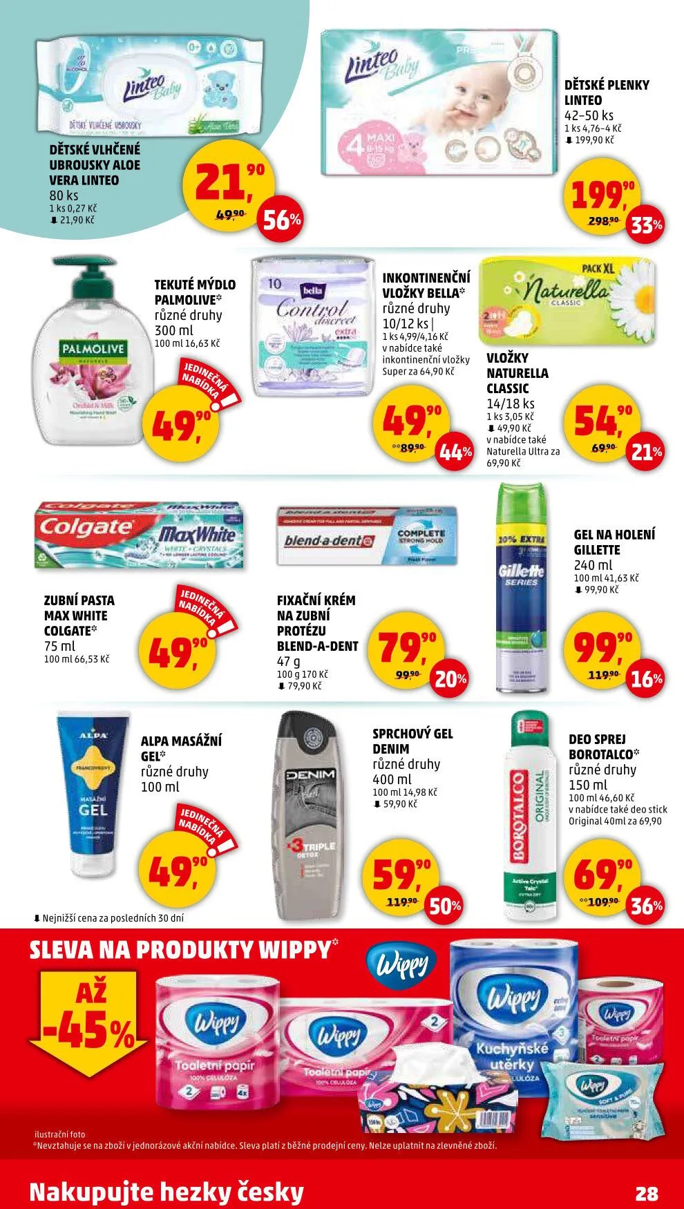 V letáku obchodu Penny Market najdete širokou nabídku produktů pro každodenní potřeby. Mezi nimi jsou dětské vlhčené ubrousky s aloe vera Linteo (80 ks) za 21,90 Kč. Dále zubní pasta Max White Colgate (75 ml) za 66,53 Kč a tekuté mýdlo Palmolive (300 ml) za 49,90 Kč.