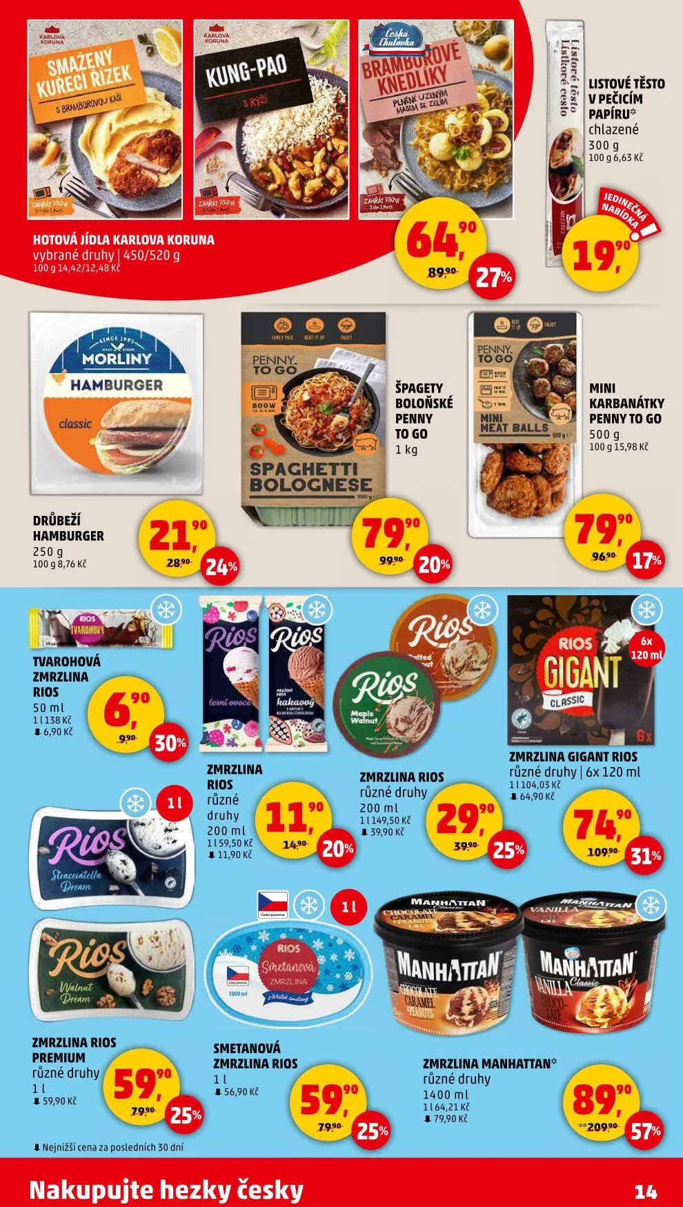 V letáku obchodu Penny Market najdete širokou nabídku hotových jídel a zmrzlin. Mezi vybranými druhy hotových jídel se objevují například špagety boloňské a drůbeží hamburger. Ceny začínají na 6,63 Kč za 100 g.