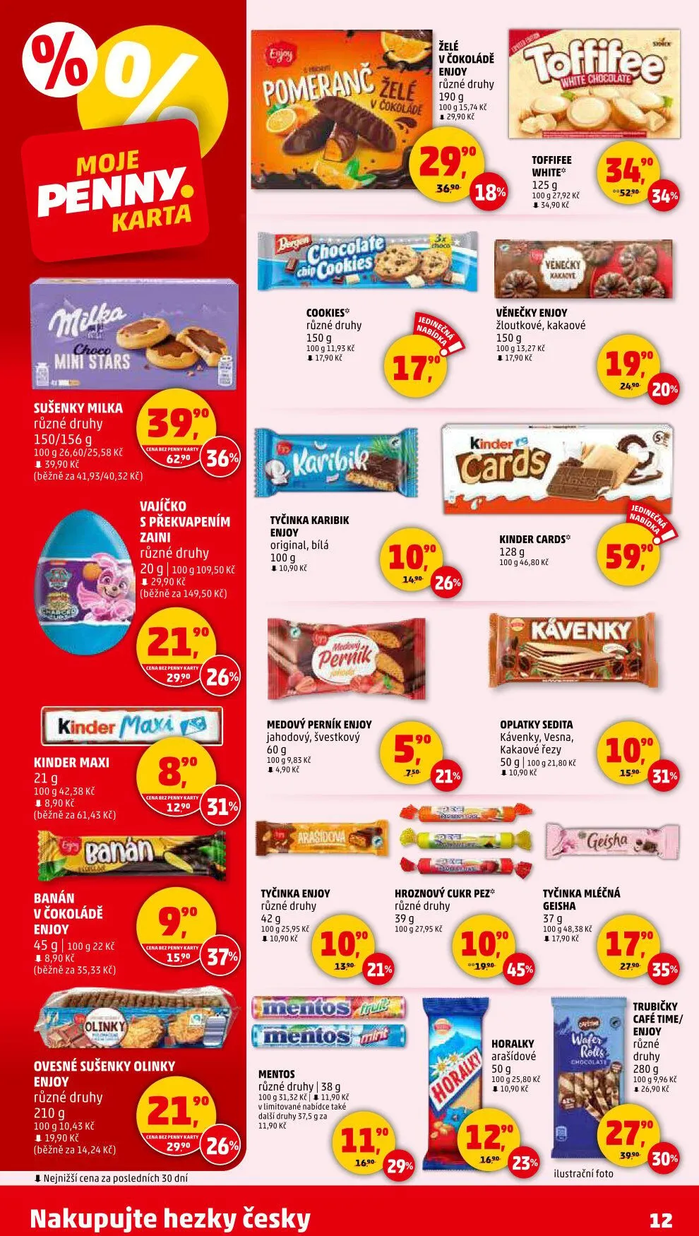 V letáku obchodu Penny Market najdete širokou nabídku sladkostí a pochutin. Mezi nimi jsou želé v čokoládě značky Enjoy, různé druhy za 29,90 Kč. Dále si můžete vychutnat mini stars Toffifee white za 54,90 Kč nebo žloutkové a kakaové věnečky Enjoy.