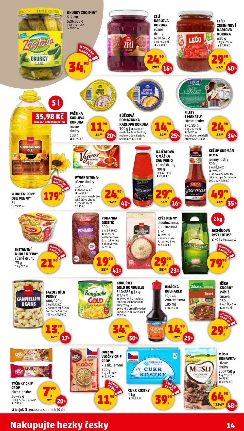 V letáku obchodu Penny Market najdete širokou nabídku produktů za skvělé ceny. Mezi nimi jsou čerstvé okurky Znojmia za 29,90 Kč, paštika Karlova koruna v různých druzích za 11,90 Kč a vývar Vitana za 24,90 Kč. Dále si můžete pořídit rajčatovou omáčku San Fabio za 42,71 Kč/kg nebo rýži Penny za 29,90 Kč.