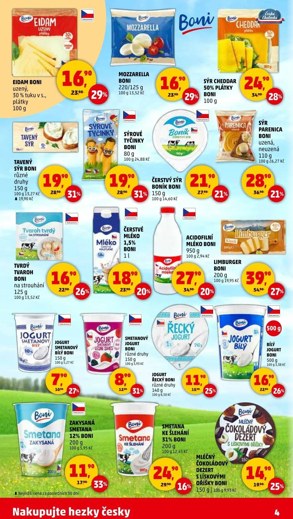 V letáku obchodu Penny Market najdete širokou nabídku mléčných výrobků značky Boni. Mezi nimi se nachází eidam v plátcích s 30 % tuku, tavené sýrové tyčinky, mozzarella a čerstvé mléko. Dále nabízíme tvrdý tvaroh, jogurty v různých variantách, včetně smetanového a řeckého jogurtu. Nezapomeňte také na zakysanou smetanu a smetanu ke šlehání. Pro milovníky sladkostí máme čokoládový dezert s lískovými oříšky. Všechny produkty jsou cenově dostupné a kvalitní. Nakupujte hezky česky!