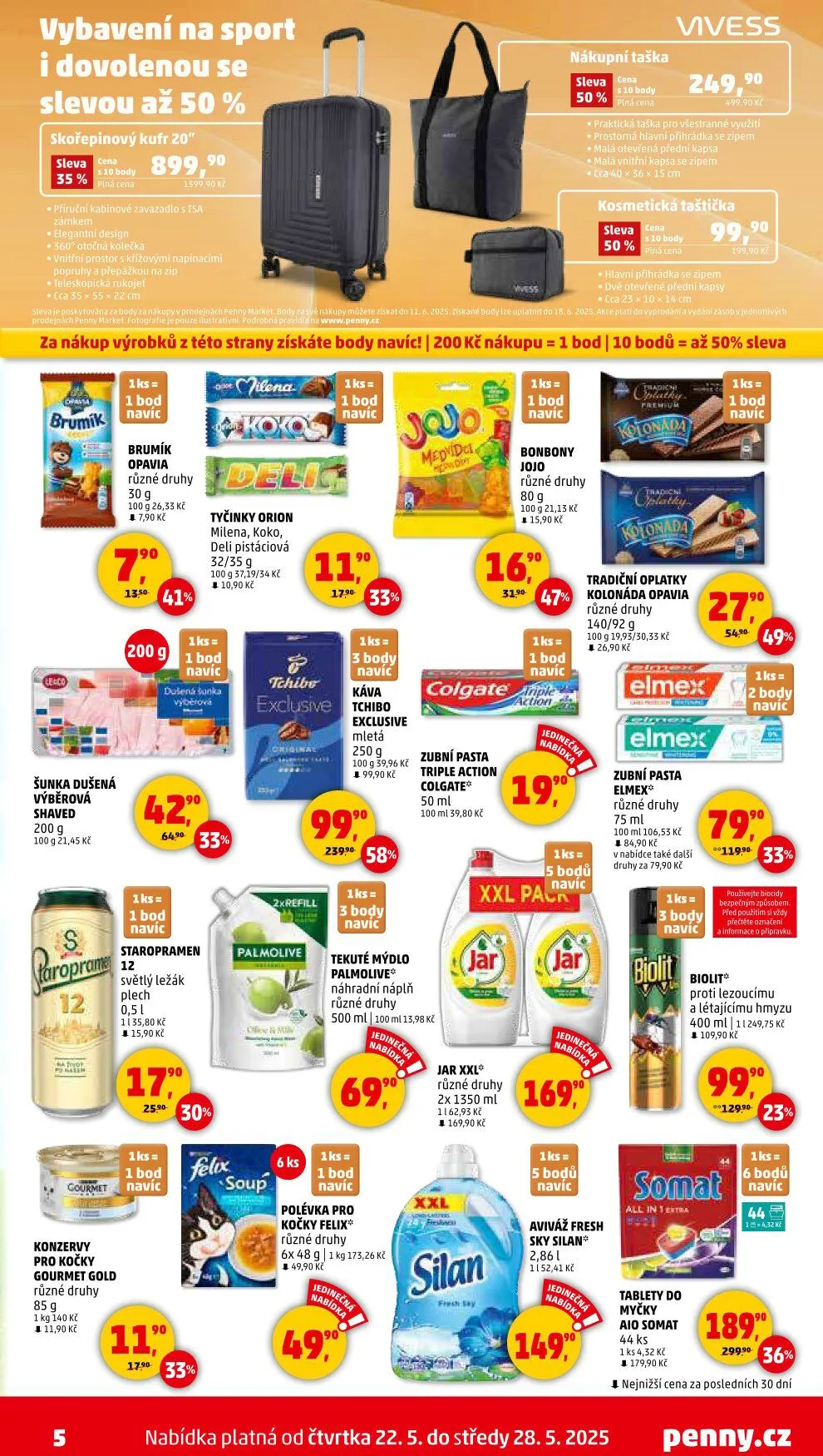 V letáku obchodu Penny Market najdete širokou nabídku produktů se slevami až 50 %. Mezi zajímavé položky patří plíživé kabinové zavazadlo s TSA zámkem, elegantním designem a 360° točnými kolečky za cenu 899,90 Kč. Dále nabízíme praktickou tašku pro všestranné využití za 299,90 Kč, která má prostornou hlavní přihrádku a několik kapes.