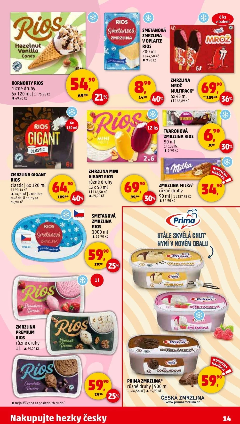 V letáku obchodu Penny Market najdete širokou nabídku zmrzlin různých druhů. Mezi oblíbené produkty patří smetanová zmrzlina v oplatce Rios (200 ml) za 9,90 Kč a zmrzlina Milka (90 ml) za 34,90 Kč. Pro milovníky klasiky je k dispozici zmrzlina Gigant (6x 120 ml) za 74,90 Kč. Nezapomeňte také na zmrzlinu Mrož v multipacku (6x 45 ml) za 6x 12 ks. V nabídce jsou i tvarohové zmrzliny Rios (50 ml) za 6,90 Kč a zmrzlina Premium Rios za 59,90 Kč. Všechny produkty jsou nyní za akční ceny, takže neváhejte a dopřejte si sladké osvěžení!