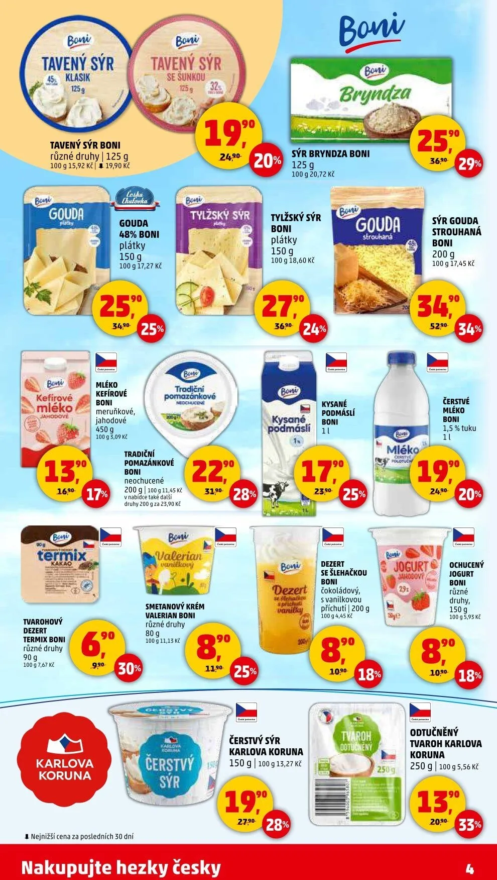 Všechny produkty jsou cenově dostupné, například kefírové mléko za 3,09 Kč za 100 g nebo čerstvé mléko Boni s 11 % tuku. Nezapomeňte také na odtučněný tvaroh Karlova koruna a čerstvý sýr, které jsou skvělou volbou pro zdravou stravu.