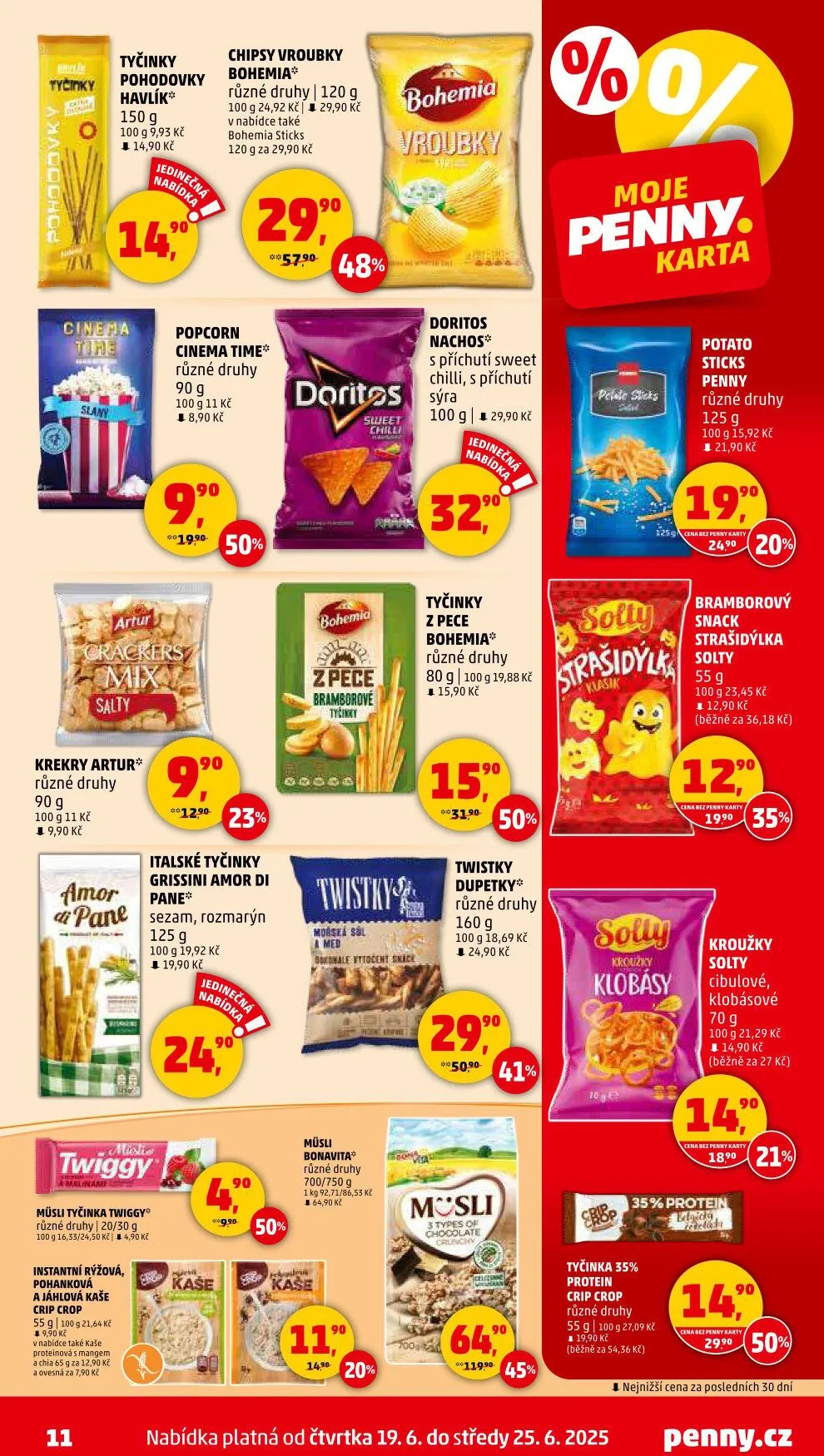 V letáku obchodu Penny Market najdete širokou nabídku snacků a pochutin. Mezi oblíbené produkty patří chipsy vroubky, tyčinky Bohemia a pohodovky. Nabízíme také popcorn Cinema Time a různé druhy nachos s příchutí sweet chilli nebo sýra.