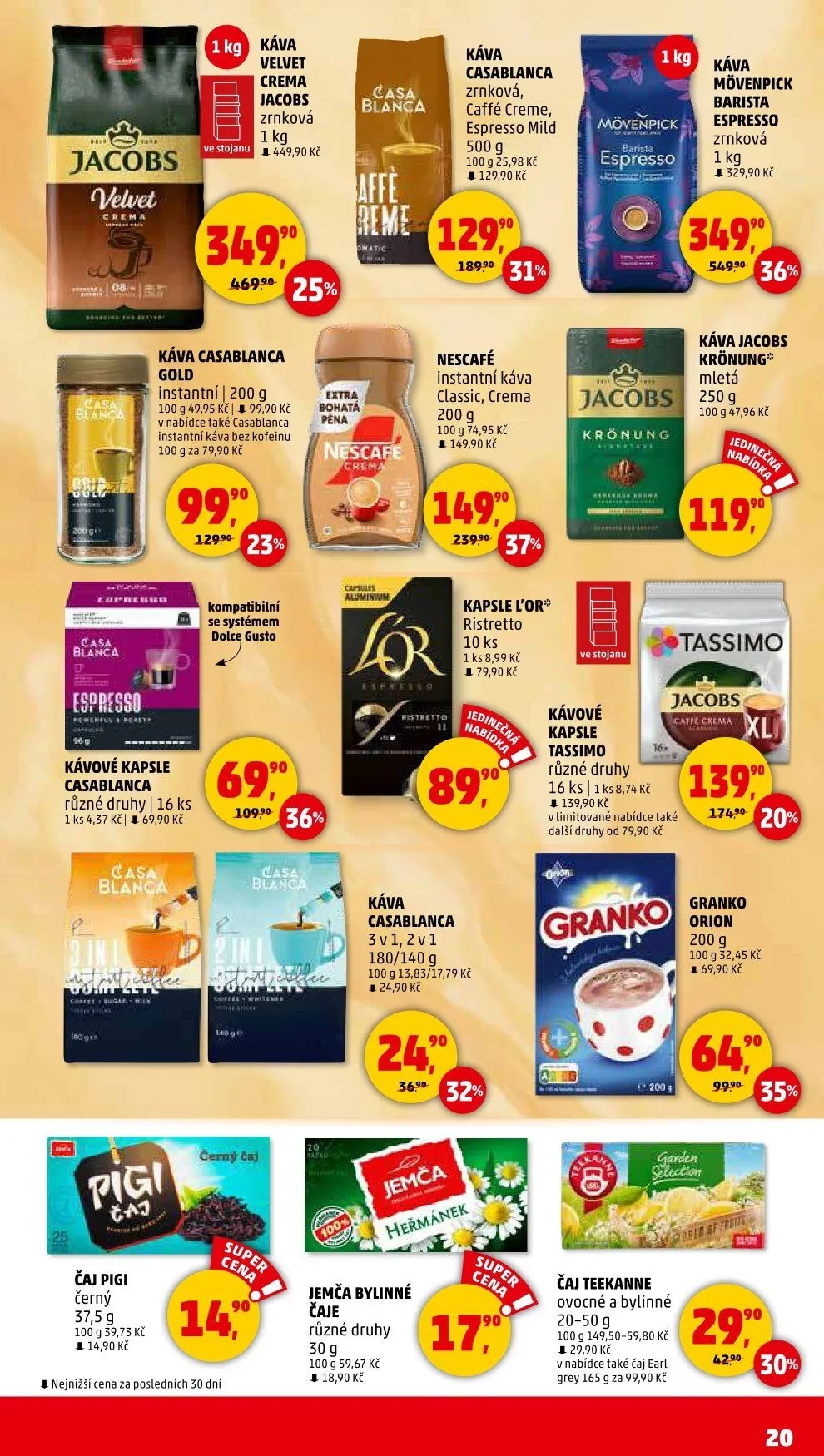 Nezapomeňte také na čaje, jako je černý čaj Pigi 37,5 g za 14,90 Kč a bylinné čaje Jemča za 18,90 Kč.