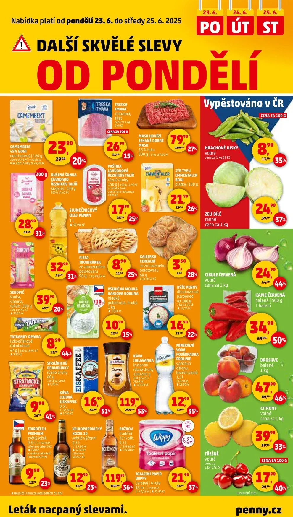 V letáku obchodu Penny Market najdete skvělé nabídky, které platí od 23. do 25. června 2025. Mezi lákavými produkty se objevuje chlazená treska, camembert Boni, dušená šunka a řezníkův talíř. Nechybí ani lahůdková paštika a sekané maso.