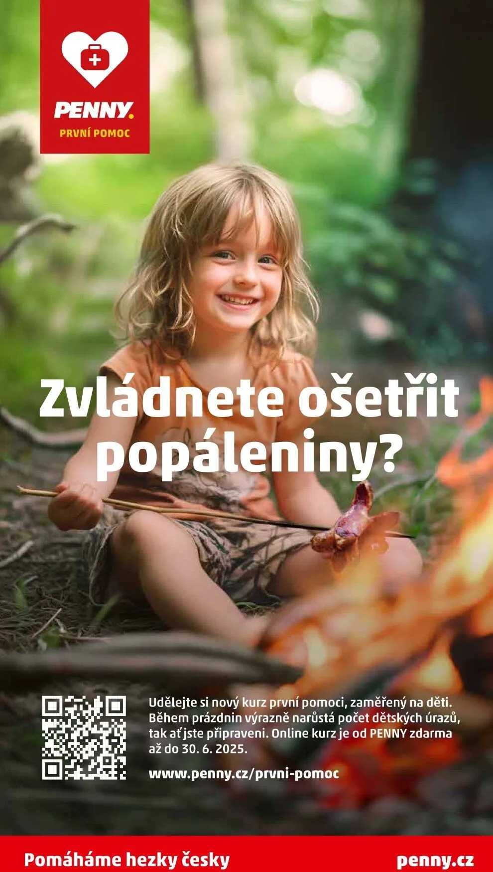 V letáku obchodu Penny Market najdete skvělou nabídku na kurz první pomoci, který je zaměřený na ošetření dětských úrazů. S příchodem prázdnin se zvyšuje počet dětských úrazů, a proto je důležité být připraven. Tento online kurz je zdarma až do 30.6.2025. Nezmeškejte tuto příležitost a získejte potřebné dovednosti na www.penny.cz/prvni-pomoc. Pomáháme hezky česky!
