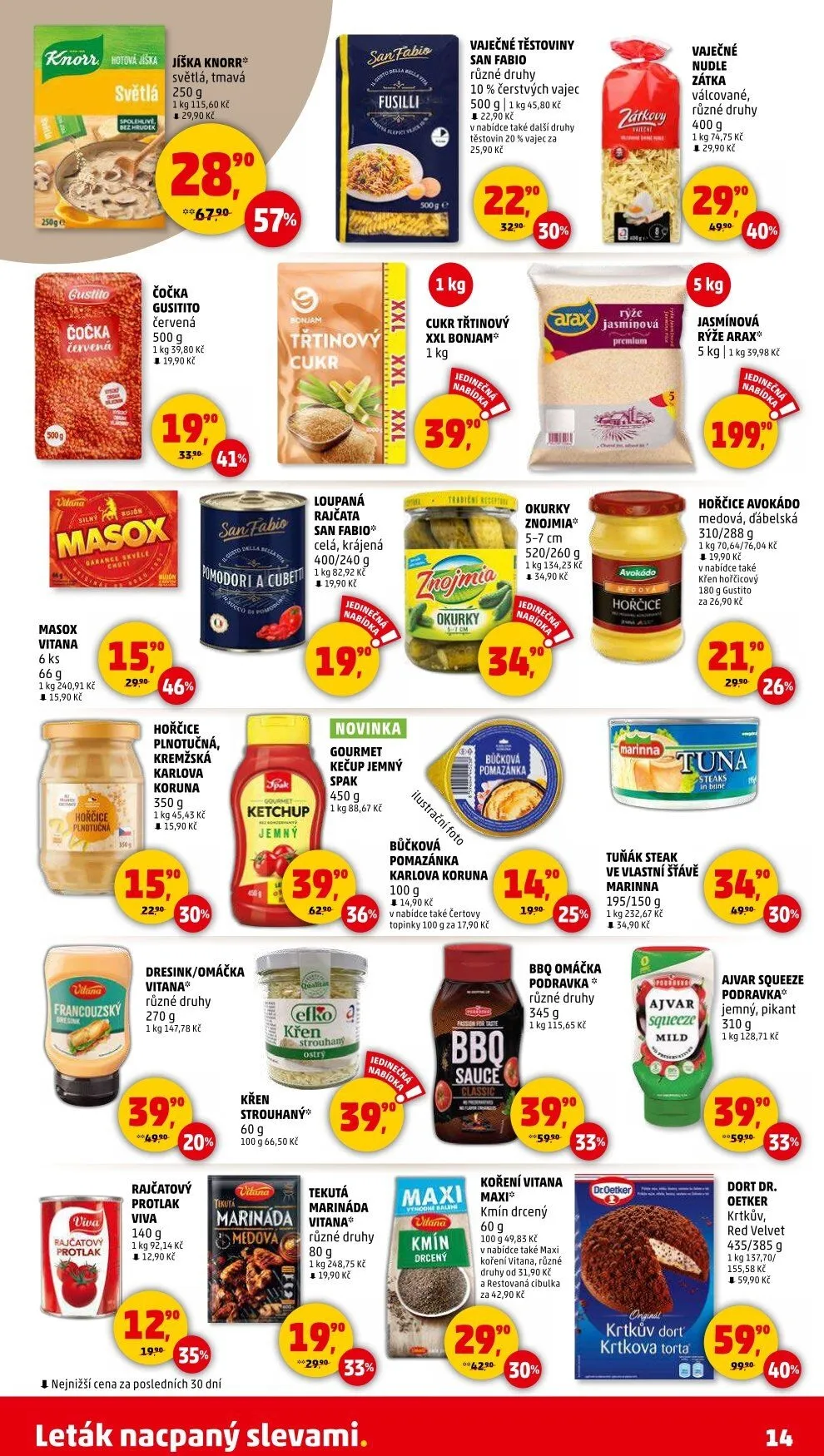 V letáku obchodu Penny Market najdete širokou nabídku produktů za skvělé ceny. Mezi nimi jsou například světlá jíška Knorr za 29,90 Kč, červená čočka Gusitito za 19,90 Kč a loupaná rajčata San Fabio za 19,90 Kč. Novinkou je jemný kečup Gourmet za 22,90 Kč a vaječné těstoviny San Fabio s 10 % čerstvých vajec za 25,90 Kč.