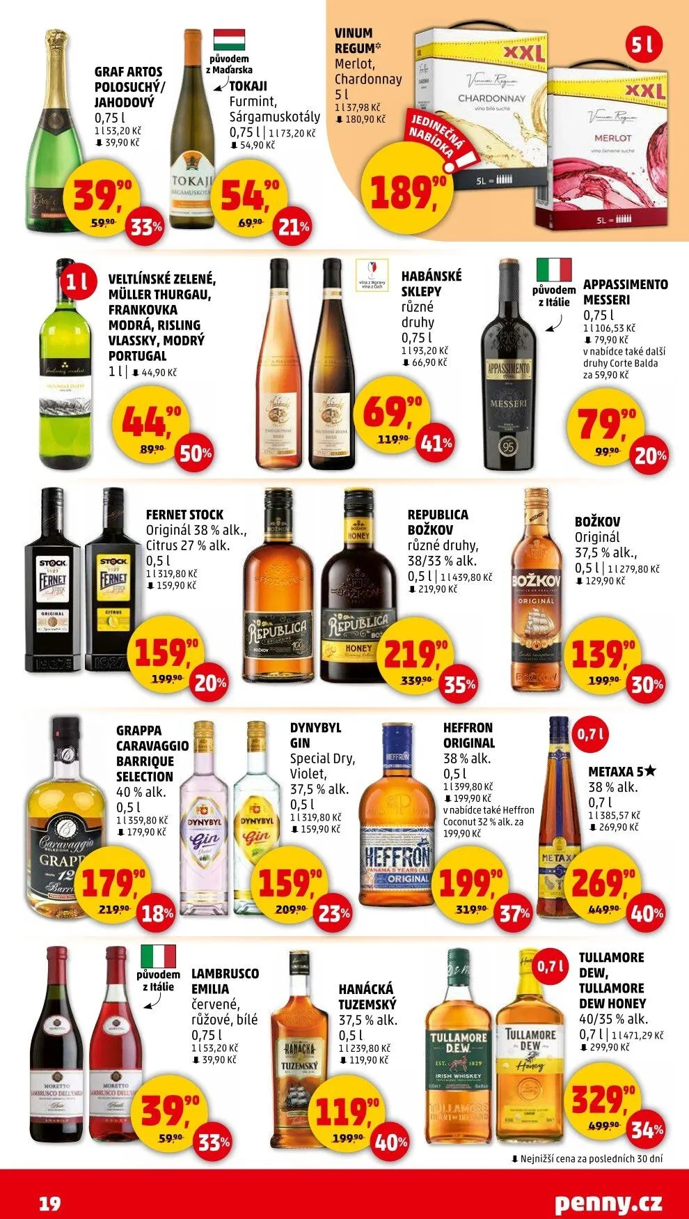 V letáku obchodu Penny Market najdete širokou nabídku kvalitních vín a lihovin. Mezi zajímavé produkty patří polosuché jahodové víno Graf Artos za 39,90 Kč, které pochází z Maďarska. Dále si můžete vybrat z vína Tokaji Furmint a Sárgamuskotály za 54,90 Kč nebo Merlot a Chardonnay z řady Vinum Regum za 57,98 Kč.