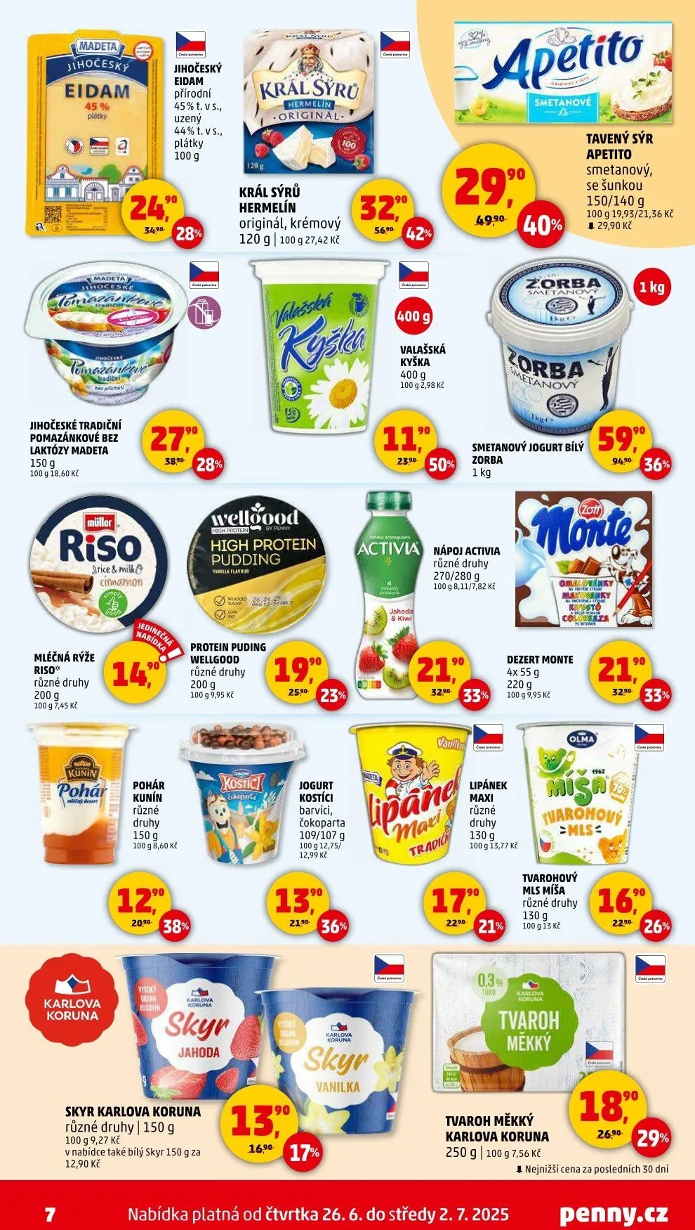 V nabídce najdete také tvarohové výrobky, jako je měkký tvaroh Karlova koruna a tvarohový dezert Mls Míša. Akce platí od 26. června do 2. července 2025, takže neváhejte a využijte nejnižší ceny za posledních 50 dní!