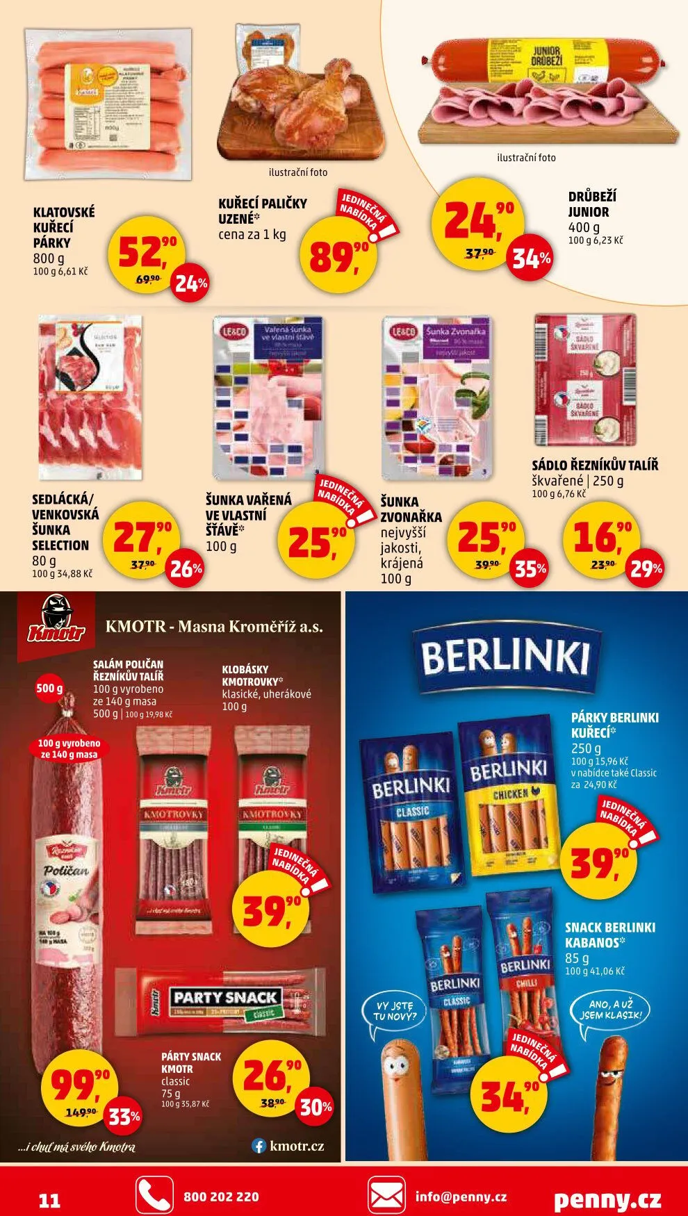 V letáku obchodu Penny Market najdete širokou nabídku masných výrobků. Mezi nimi se objevují klatovské kuřecí párky o hmotnosti 800 g za 6,61 Kč/100 g. Dále si můžete vybrat sedláckou šunku selection, která je k dispozici v balení 80 g za 54,88 Kč/100 g.