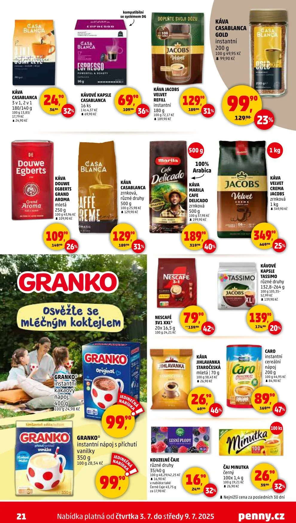 V letáku obchodu Penny Market najdete širokou nabídku káv a čajů. Mezi oblíbené produkty patří káva Casablanca v různých variantách, jako jsou instantní 3v1 a 2v1, nebo zrnková káva. Káva Douwe Egberts nabízí aroma blanca v kapslích a mletou variantu Grand Aroma. Pro milovníky instantní kávy je tu Jacobs Velvet a Marila Cafe Delicado.