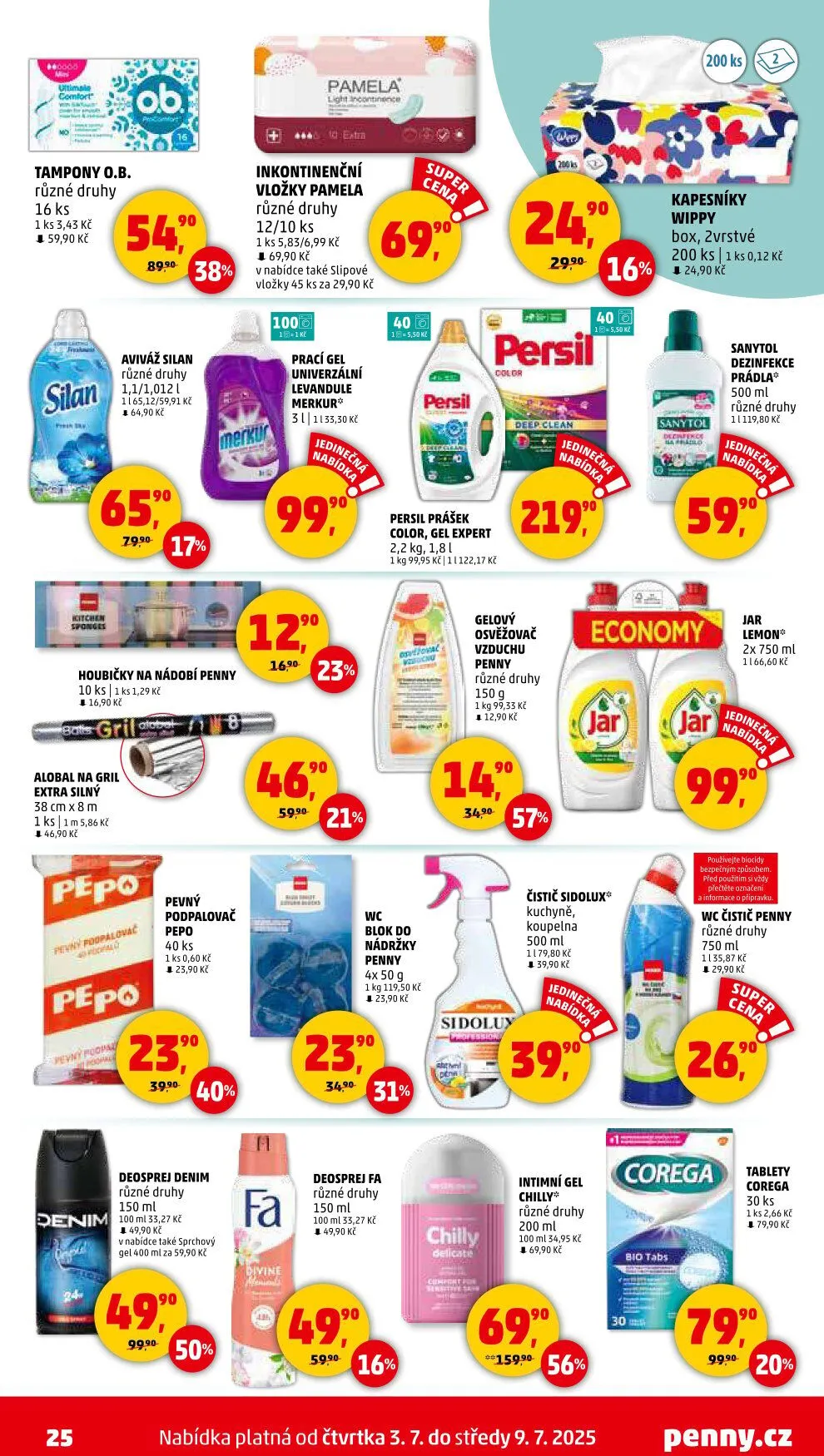 V letáku obchodu Penny Market najdete širokou nabídku produktů pro každodenní potřeby. Mezi nimi jsou například tampony o.b. v různých druzích, balení po 16 ks za 59,90 Kč. Dále nabízíme inkontinenční vložky Pamela, které jsou k dostání za 69,90 Kč.