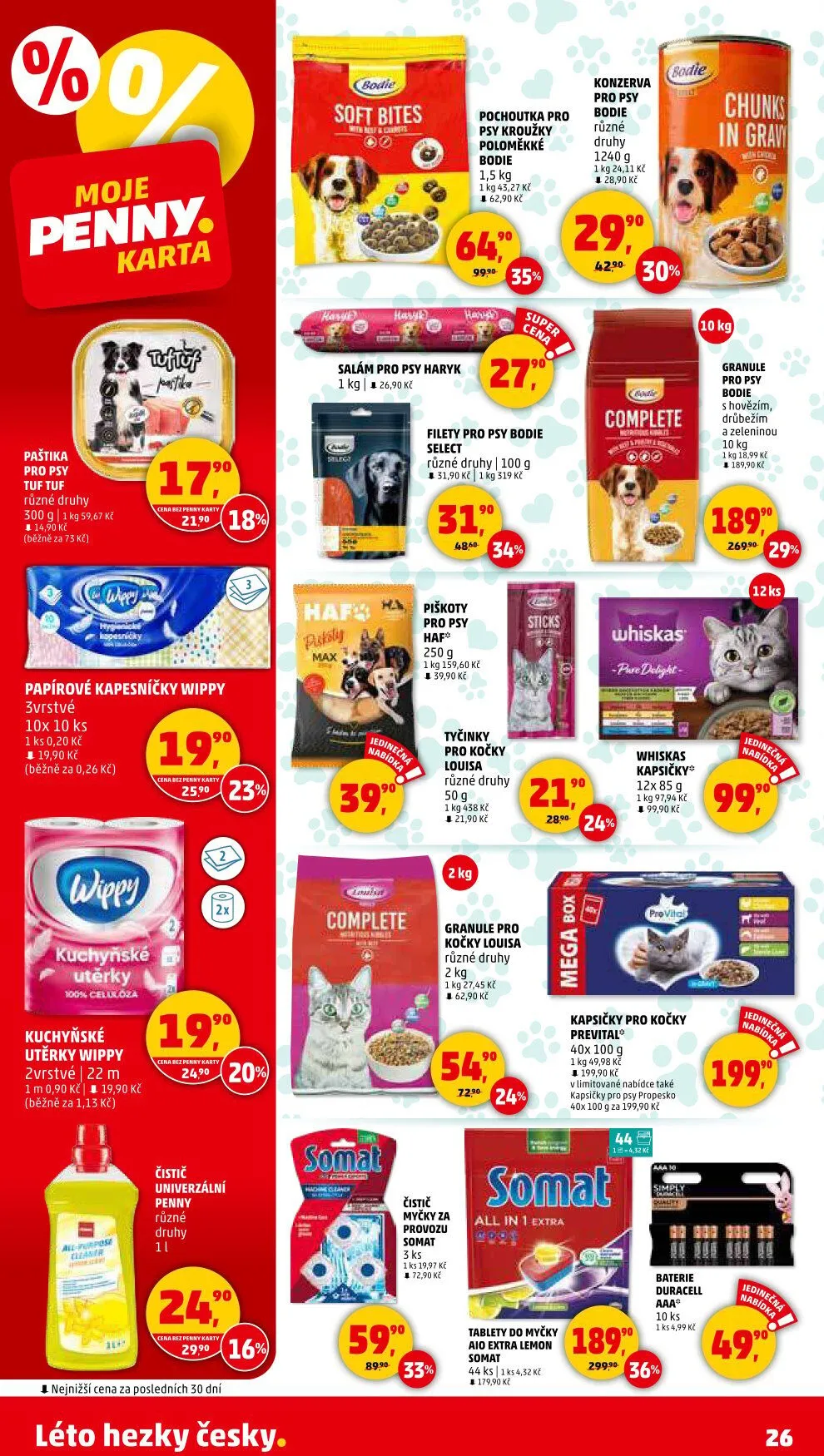 Dále si můžete pořídit univerzální čistič Penny (16,90 Kč) nebo kuchyňské utěrky Wippy (2vrstvé, 19,90 Kč). V nabídce jsou také kapsičky pro kočky Whiskas (12x 85 g za 99,90 Kč) a konzervy pro psy Bodie (1240 g za 30% slevu).