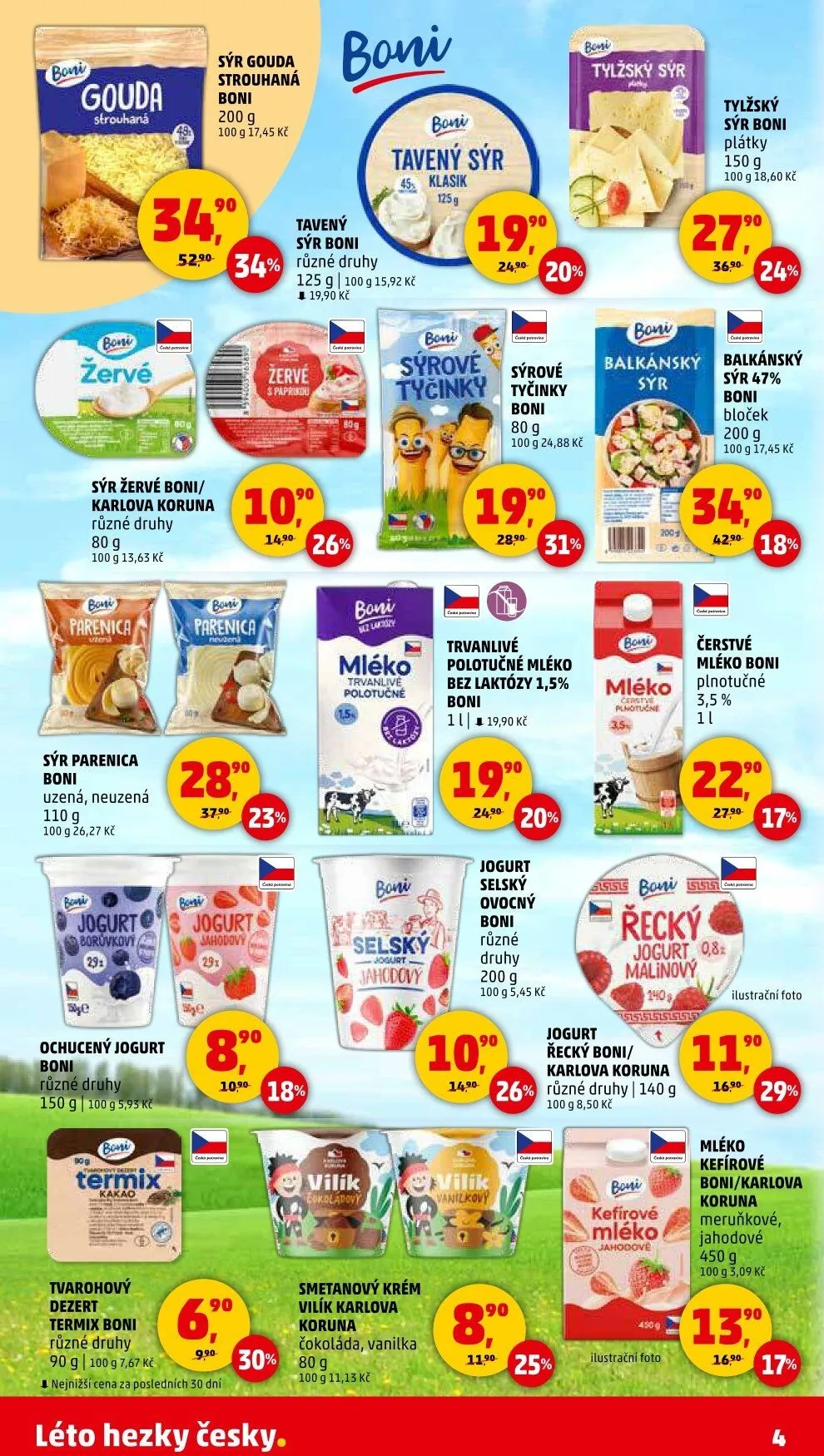 V letáku obchodu Penny Market najdete širokou nabídku mléčných výrobků a sýrů. Mezi nimi se objevují oblíbené sýry jako Gouda a žervé, které jsou k dispozici v různých variantách. Například strouhaný sýr Gouda od značky Boni v balení 200 g za 34,90 Kč nebo žervé v 80 g balení za 13,63 Kč.