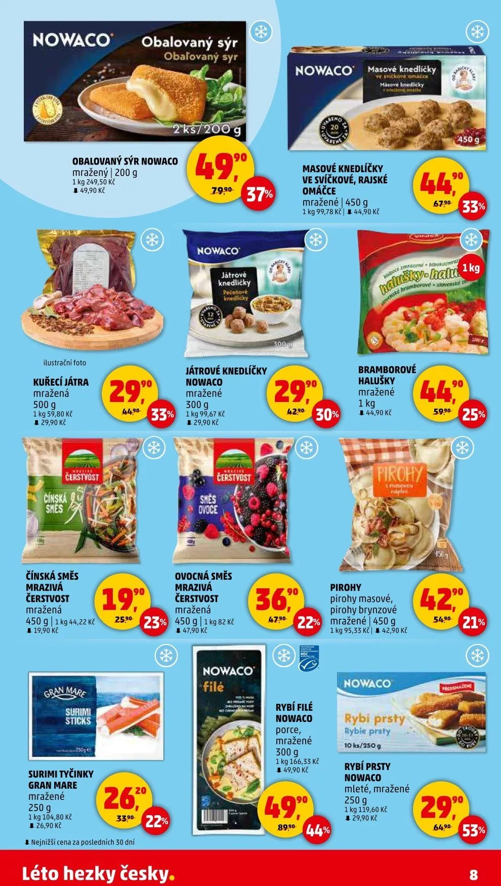 V letáku obchodu Penny Market najdete širokou nabídku mražených produktů. Mezi nimi se objevují oblíbené obalované sýry značky Nowaco, které jsou k dostání v balení po 200 g za cenu 49,90 Kč. Dále si můžete vybrat z masových knedliček, které jsou ideální jako rychlá večeře, nebo játrové knedlíčky Nowaco za 29,90 Kč za 300 g.