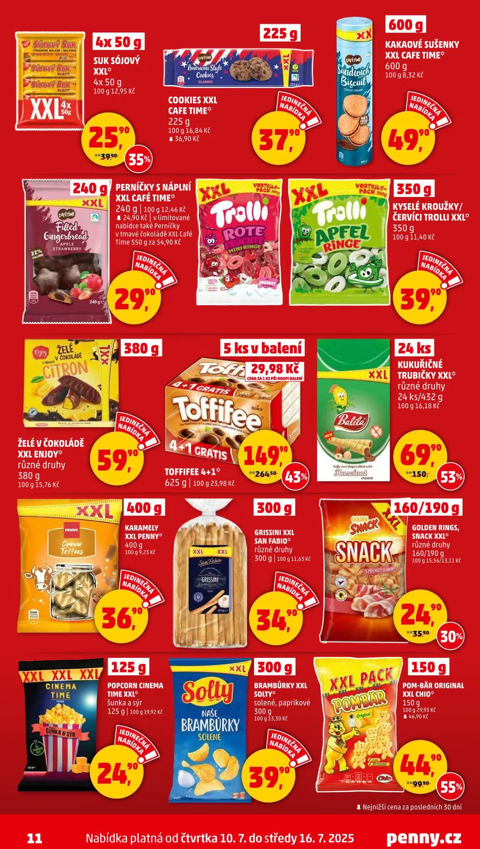 V letáku obchodu Penny Market najdete širokou nabídku produktů za skvělé ceny. Mezi nimi jsou například sójové sušenky XXL, které jsou k dostání v balení po 4x50 g za 12,95 Kč za 100 g. Dále si můžete vychutnat perníčky s náplní Café Time, které stojí 24,90 Kč za 240 g.