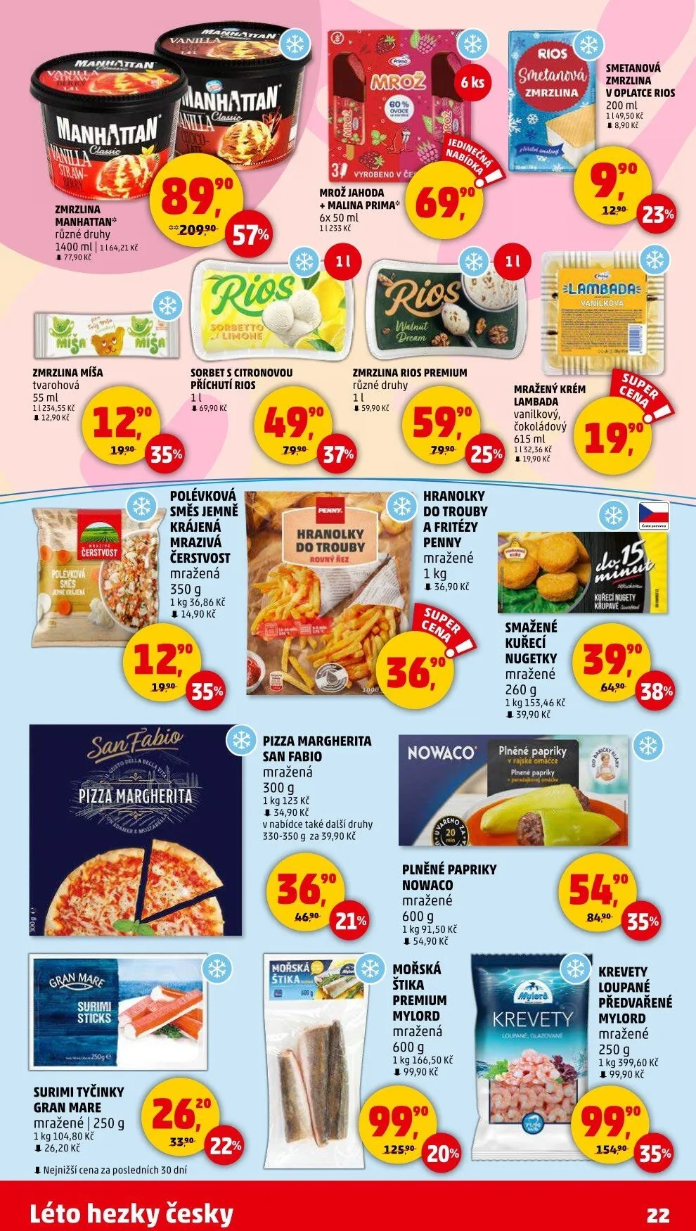 V letáku obchodu Penny Market najdete širokou nabídku mražených produktů. Mezi oblíbené zmrzliny patří smetanová zmrzlina v oplatce Rios (200 ml) za 11,49 Kč a jahodovo-malinová zmrzlina Mrož (6x50 ml) za 77,90 Kč. Pro milovníky sorbetů je k dispozici citronový sorbet Mos za 69,90 Kč.